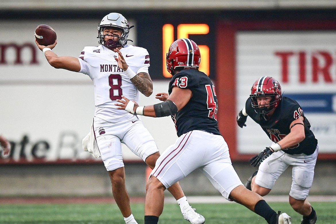 Grizzlies quarterback Keali'i Ah Yat (8) throws a 50-yard touchdown pass to wide receiver Drew Deck in the second quarter against Central Washington on Saturday, Sept. 6. (Casey Kreider/Daily Inter Lake)