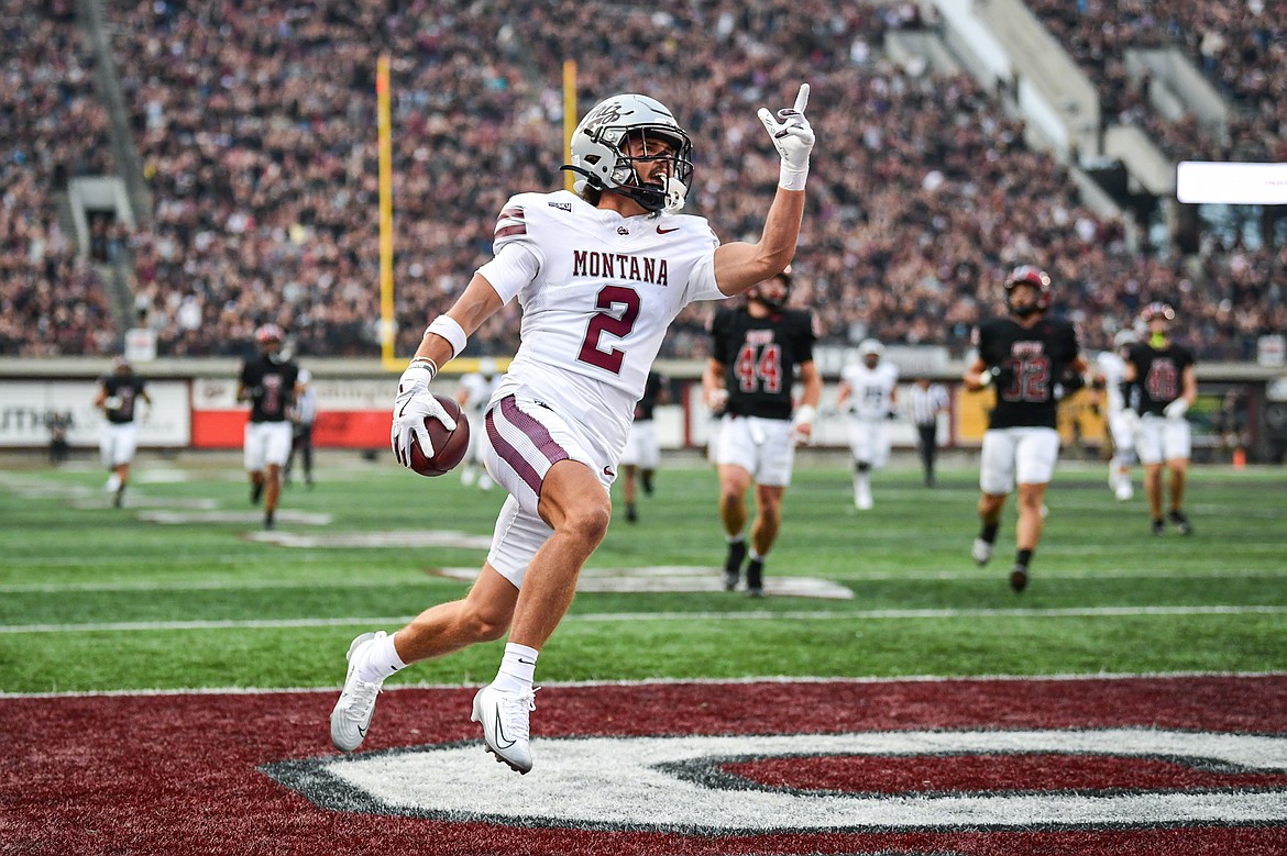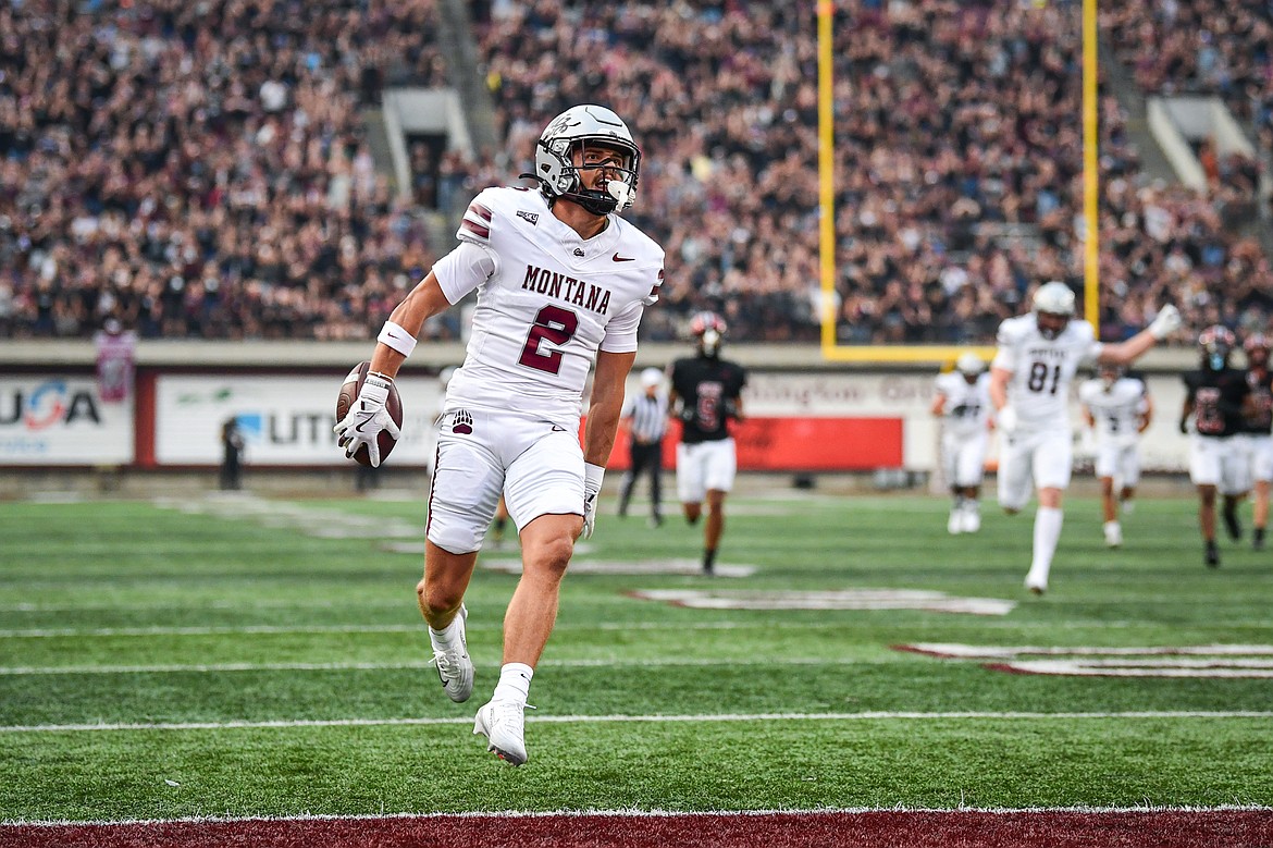 Grizzlies wide receiver and Glacier High graduate Drew Deck (2) scores a touchdown on a 50-yard reception in the second quarter against Central Washington on Saturday, Sept. 6. (Casey Kreider/Daily Inter Lake) Casey Kreider