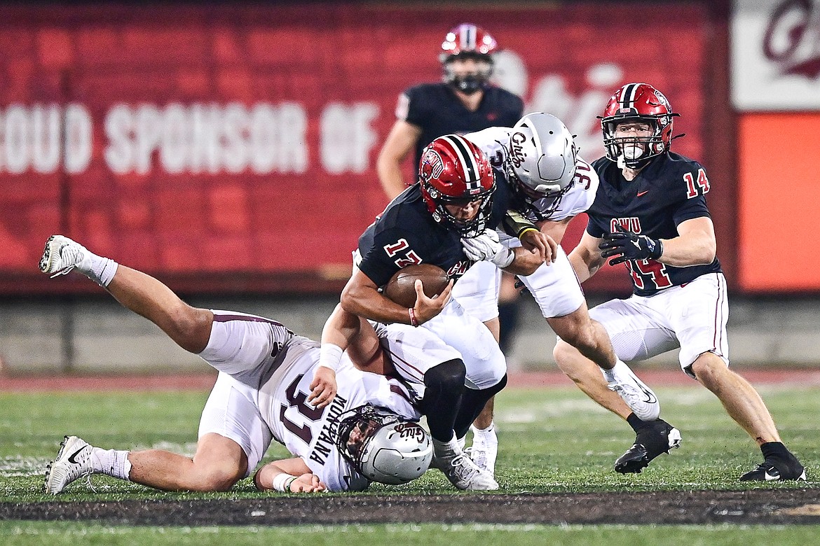 Central Washington quarterback Kendall McGill (17) is sacked by Grizzlies defenders Geno Leonard (31) and Kade Cutler (30) in the fourth quarter on Saturday, Sept. 6. (Casey Kreider/Daily Inter Lake)