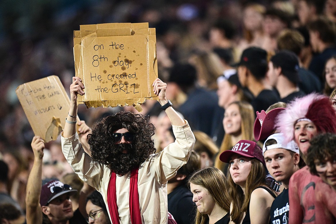 A fan in the student section dressed as Jesus Christ holds a sign as the Grizzlies face Central Washington on Saturday, Sept. 6. (Casey Kreider/Daily Inter Lake) Casey Kreider