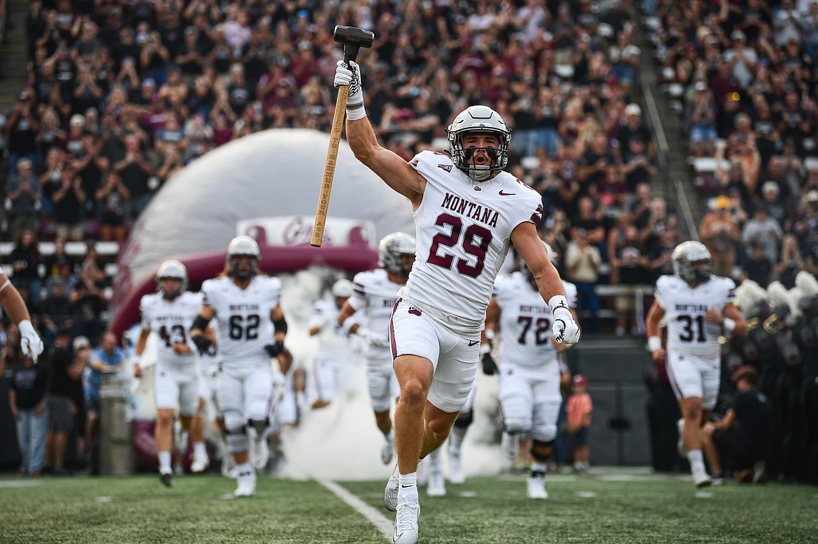 Safety Tanner Huff (29) leads the Montana Grizzlies out onto the field to take on the Central Washington Wildcats at Washington-Grizzly Stadium on Saturday, Sept. 6. (Casey Kreider/Daily Inter Lake) Casey Kreider