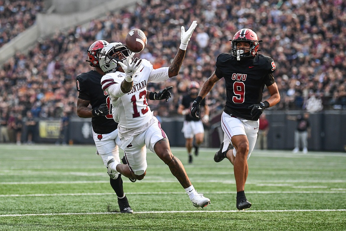 Grizzlies wide receiver Lekeldrick Bridges (13) has a pass sail just out of reach in the first half against Central Washington at Washington-Grizzly Stadium on Saturday, Sept. 6. (Casey Kreider/Daily Inter Lake) Casey Kreider