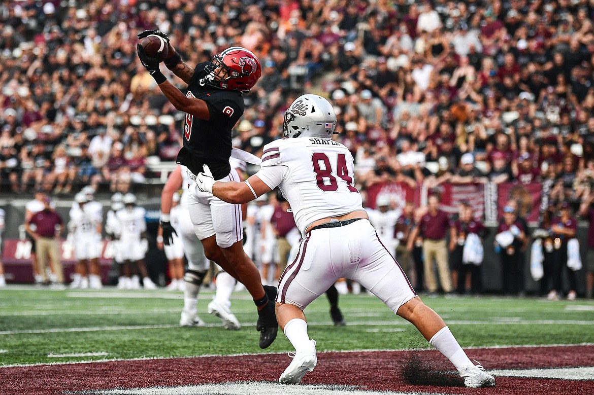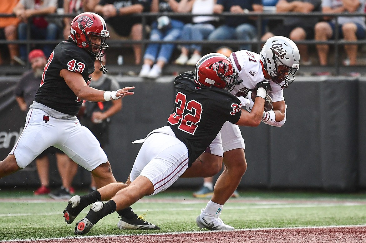 Grizzlies wide receiver and Glacier High graduate Drew Deck (2) scores a touchdown on a 50-yard reception in the second quarter against Central Washington on Saturday, Sept. 6. (Casey Kreider/Daily Inter Lake)