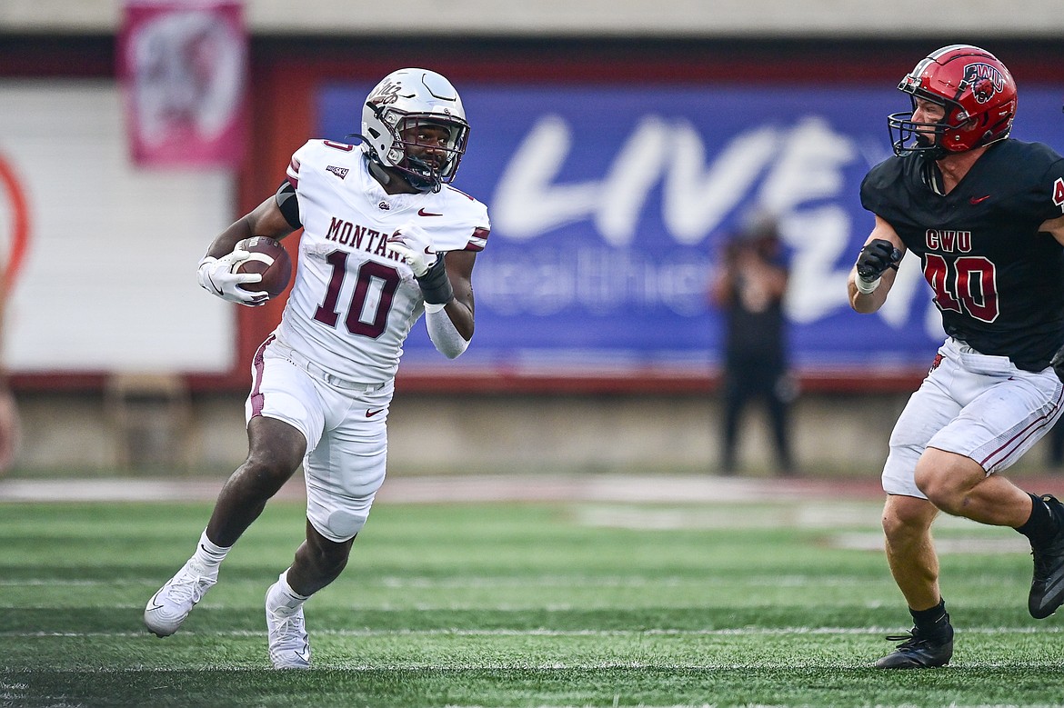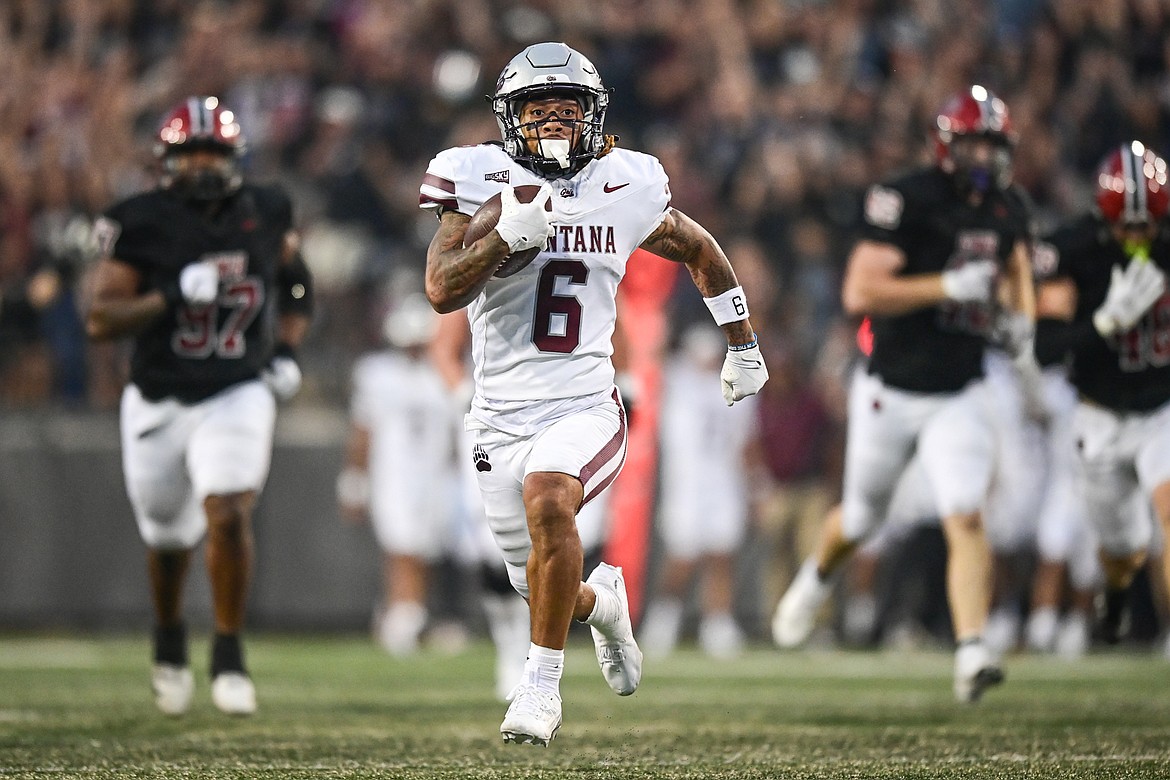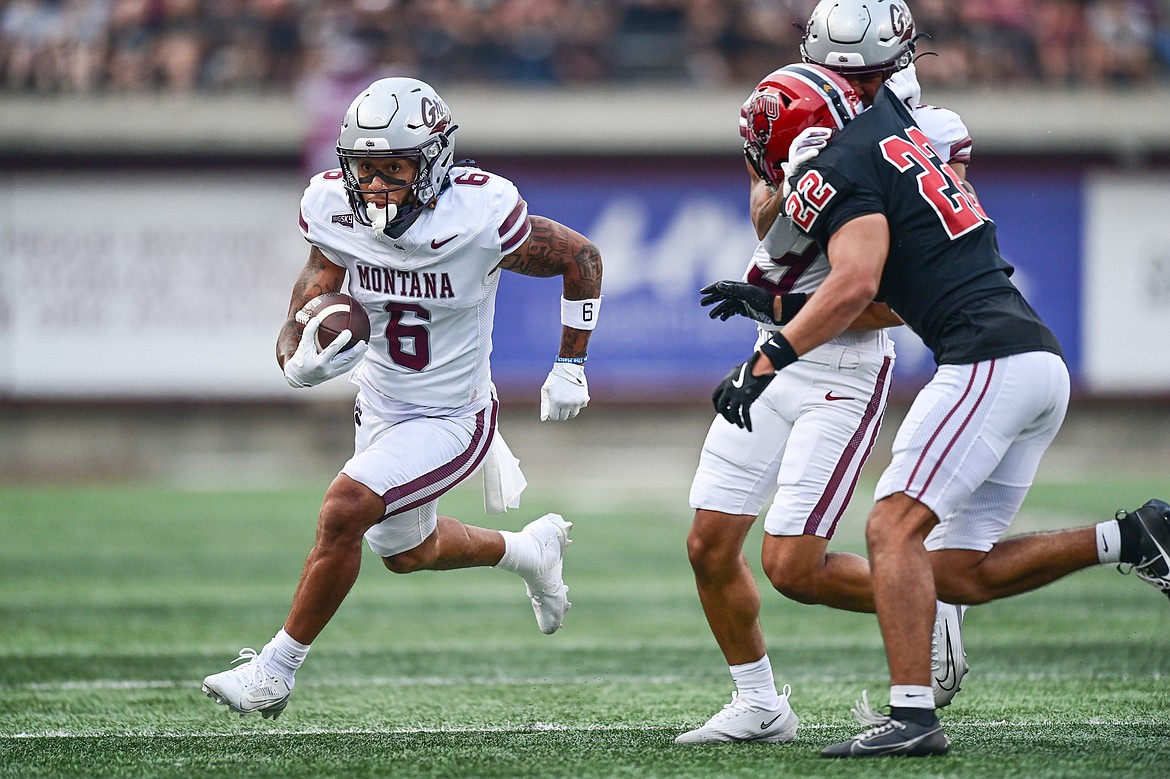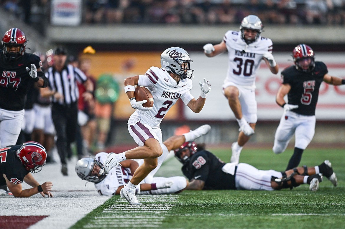 Grizzlies running back Stevie Rocker Jr. breaks a 25-yard run in the first quarter against Central Washington at Washington-Grizzly Stadium on Saturday, Sept. 6. (Casey Kreider/Daily Inter Lake)