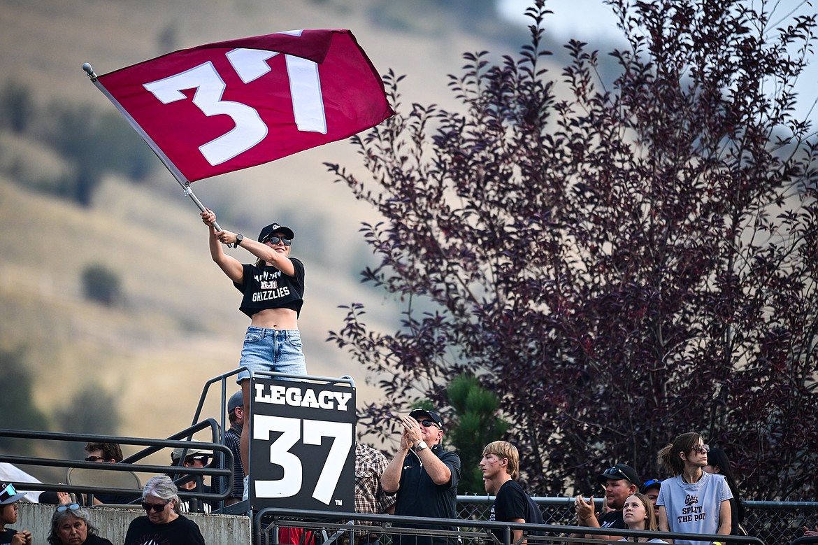 Professional skier Maggie Voisin, from Whitefish, waves the No. 37 flag before the game against Central Washington at Washington-Grizzly Stadium on Saturday, Sept. 6. (Casey Kreider/Daily Inter Lake) Casey Kreider