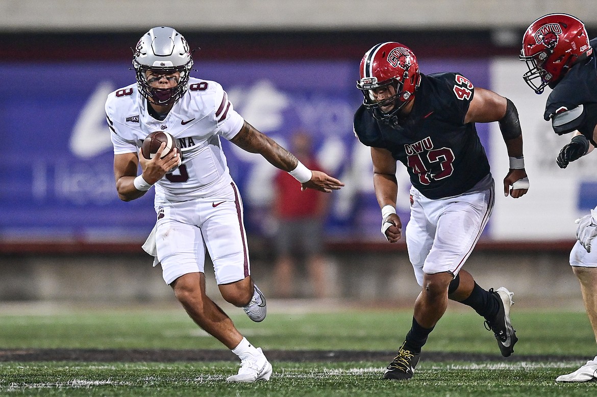Grizzlies quarterback Keali'i Ah Yat (8) picks up yardage on a run in the third quarter against Central Washington on Saturday, Sept. 6. (Casey Kreider/Daily Inter Lake)