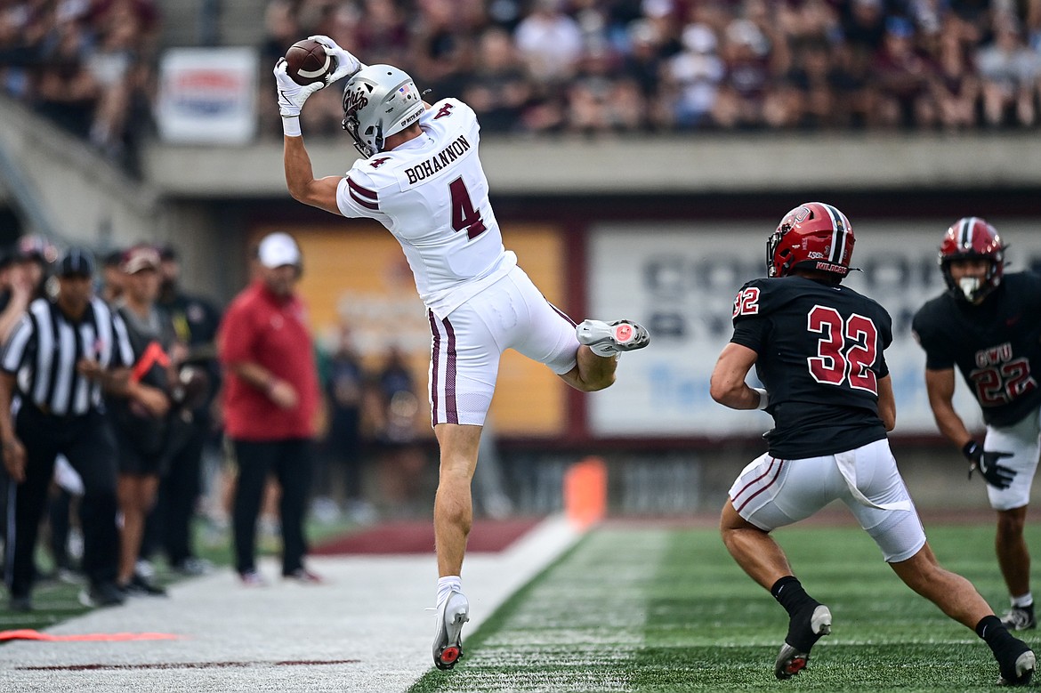 Grizzlies wide receiver Blake Bohannon (4) makes a catch along the sideline in the second quarter against Central Washington on Saturday, Sept. 6. (Casey Kreider/Daily Inter Lake) Casey Kreider