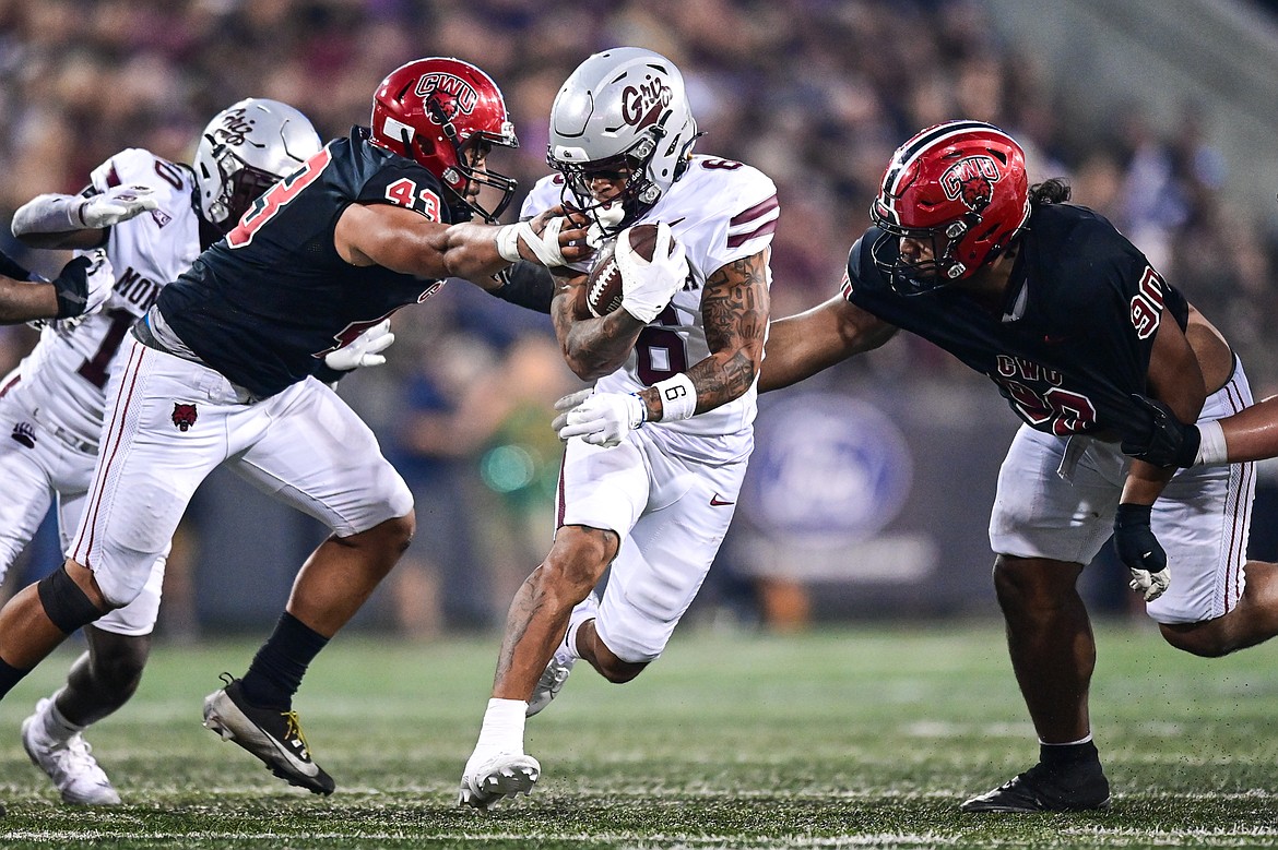 Grizzlies running back Stevie Rocker Jr. picks up yardage on a run in the third quarter against Central Washington at Washington-Grizzly Stadium on Saturday, Sept. 6. (Casey Kreider/Daily Inter Lake) Casey Kreider