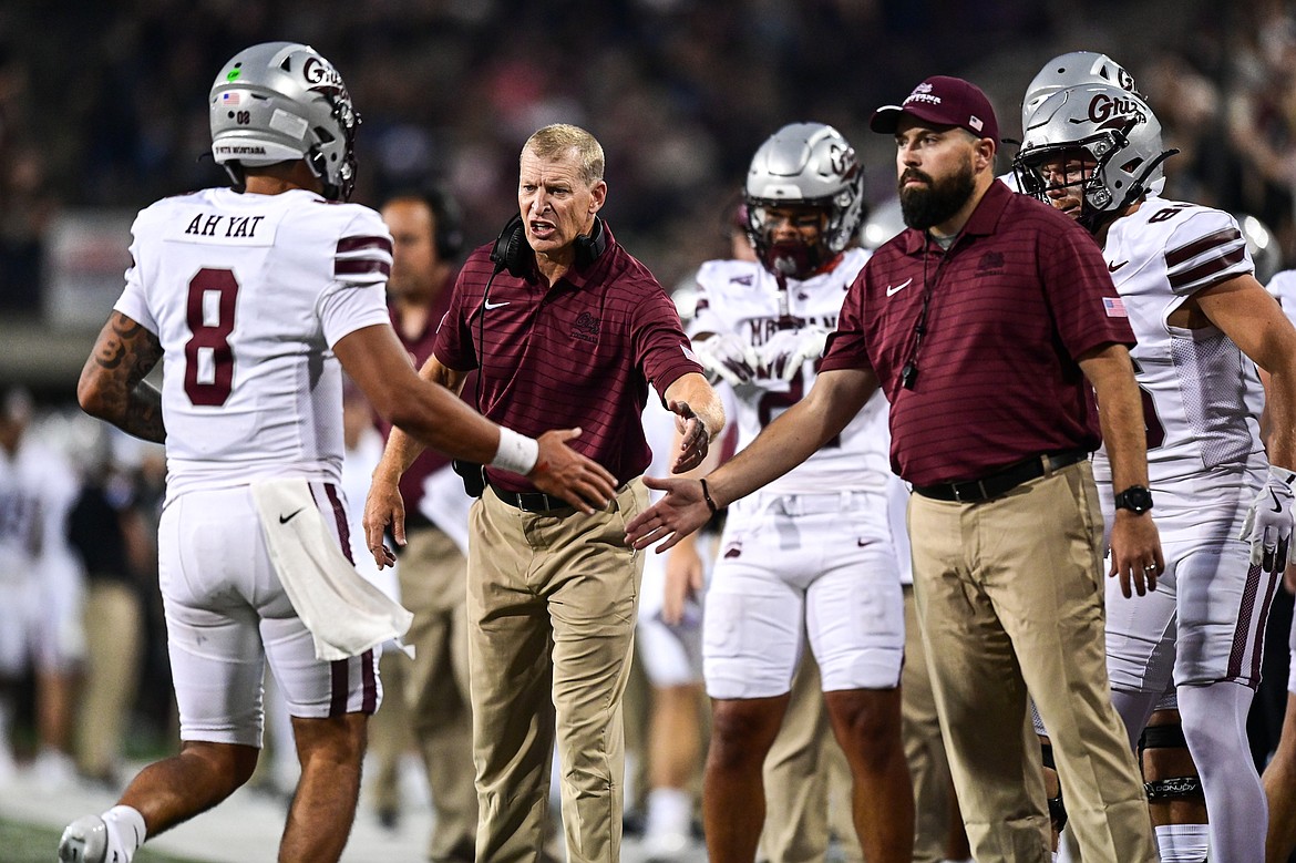 Grizzlies head coach Bobby Hauck gestures to quarterback Keali'i Ah Yat after a touchdown drive in the third quarter against Central Washington on Saturday, Sept. 6. (Casey Kreider/Daily Inter Lake)