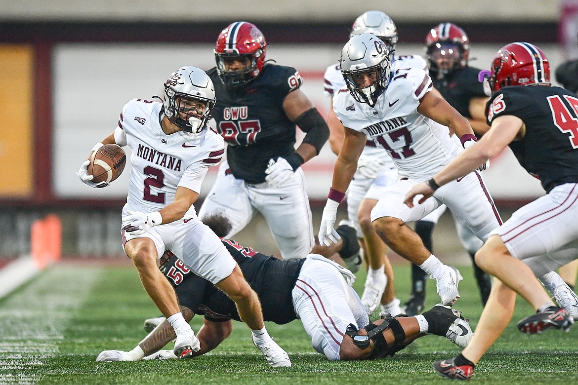 Grizzlies running back Stevie Rocker Jr. breaks a 25-yard run in the first quarter against Central Washington at Washington-Grizzly Stadium on Saturday, Sept. 6. (Casey Kreider/Daily Inter Lake) Casey Kreider