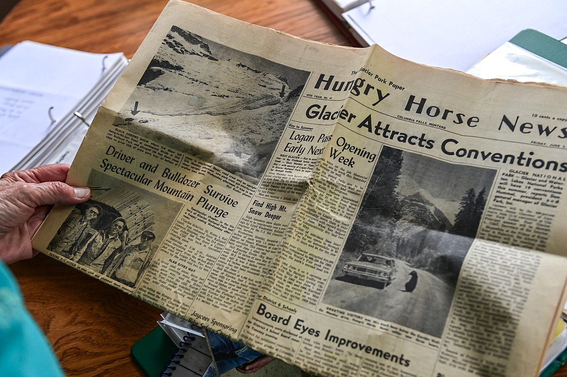 JoLynn Yenne shows a Hungry Horse News article from June 5, 1964, detailing the time Chuck Siderius, her brother, and his D-8 dozer plummeted 350 feet off a cliff at Logan Pass after a snow slab gave way while clearing the Going-to-the-Sun Road in Glacier National Park. (Casey Kreider/Daily Inter Lake)Casey Kreider