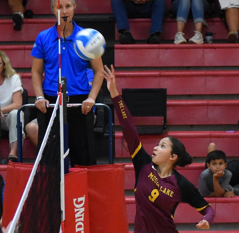 Allison Bond from the Mavs tips the ball back over the net against the Huskies during set number three. Mavs coach Krystal Trammel said she was impressed with Bond as the new setter and said there was a moment when Bond dropped to her knee and made a quick set to the middle which is something that is typically only seen at the collegiate level.ARTICLES BY CALEB PEREZ