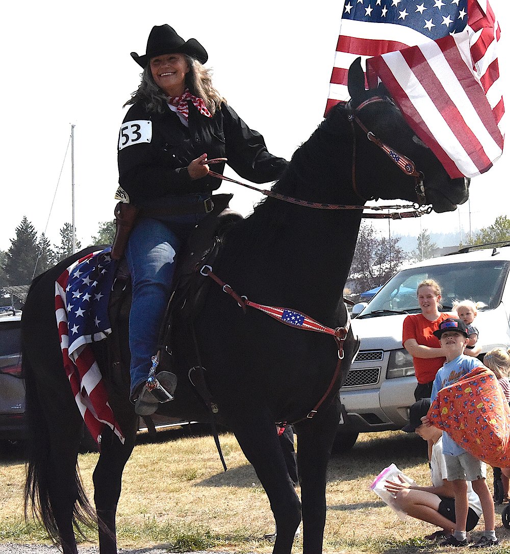 Long-time Dayton area resident Mike Meuli called out the names of participants from a spot near Dayton Park. First came Charlene Brundage carrying the American flag on her horse Shooter, who was decked out with an American flag draped over his hindquarters, a red, white, and blue bridle and breast collar. Bagpiper Dick Bratton from the Great Scots met up with New-Zealand transplant Andrew Pickering before the parade, and they marched and piped together. The Ravenhall Motorcycle Club from Polson came roaring down the street, all flying American flags.