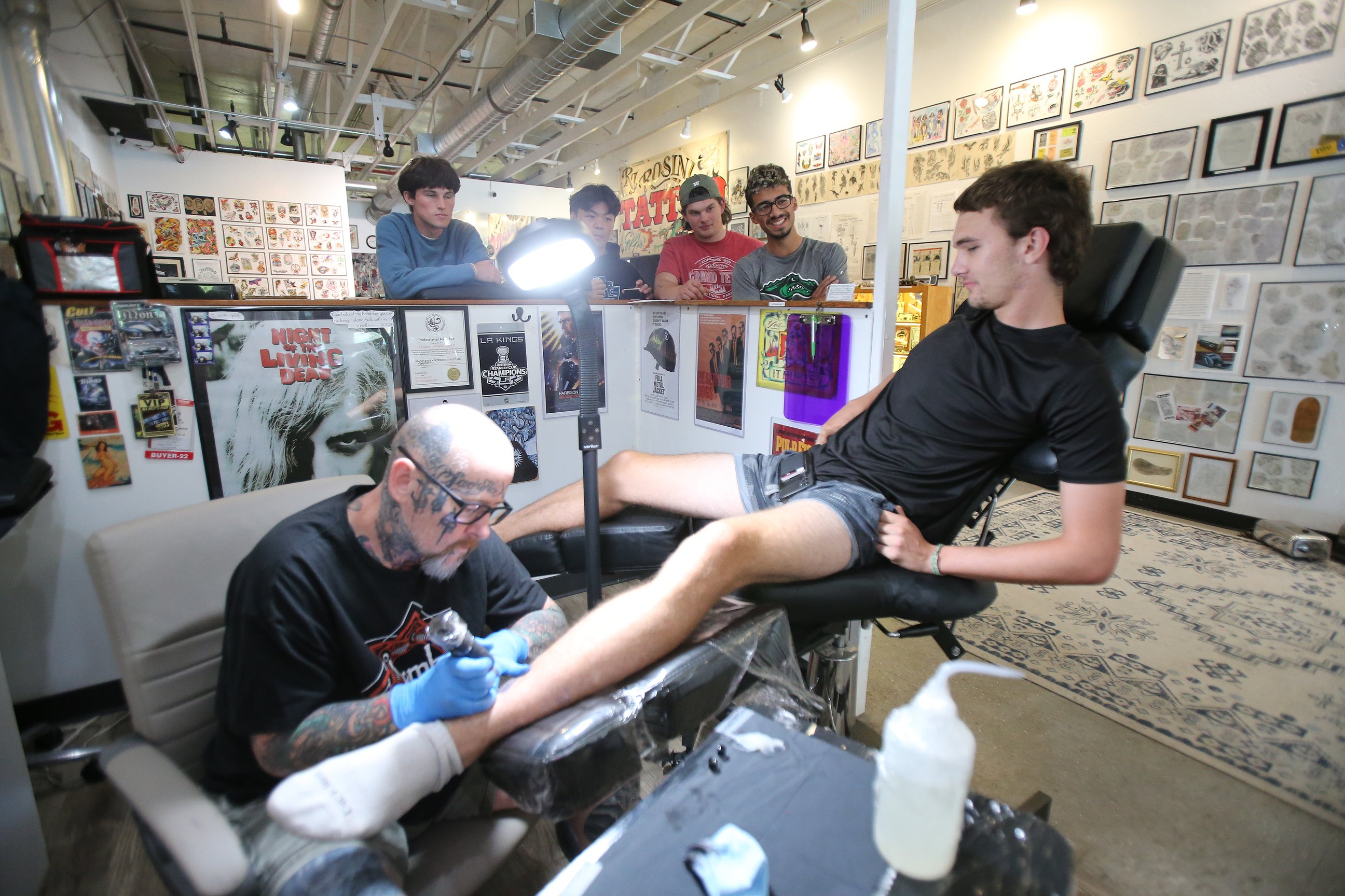 COEUR d'ALENE — A group of young men gathered to watch as one sat on the chair, leg outstretched, a grimace competing with a grin as a buzzing tattoo gun needled ink into his skin.
