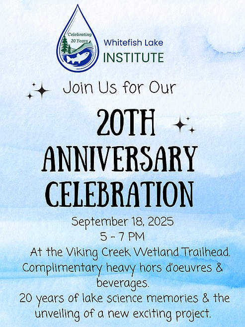 The Whitefish Lake Institute invites the public to celebrate its 20th anniversary on Thursday, Sept. 18, from 5-7 p.m. at the Viking Creek Wetland Trailhead.