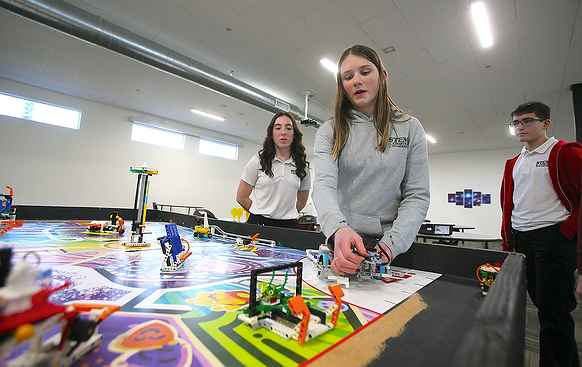 FIRST Lego League robotics team Los Cuatro Amigos members Reagan Smith, left, Kaylee Barnhart and Emmett Hernandez demonstrate how to run a mission on a robotics board at North Idaho STEM Charter Academy in February 2024. The then-eighth graders represented Idaho at the FIRST Championship in Houston that year.ARTICLES BY DEVIN WEEKS