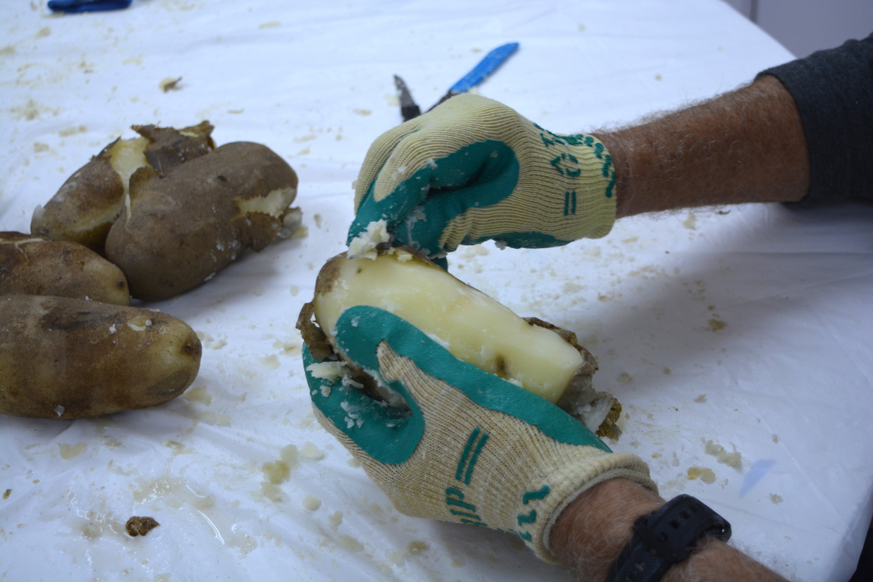 At the next station, Mert Barth and Richard Jurvelin peeled the boiled potatoes and cut out the potato eyes to remove lumps.