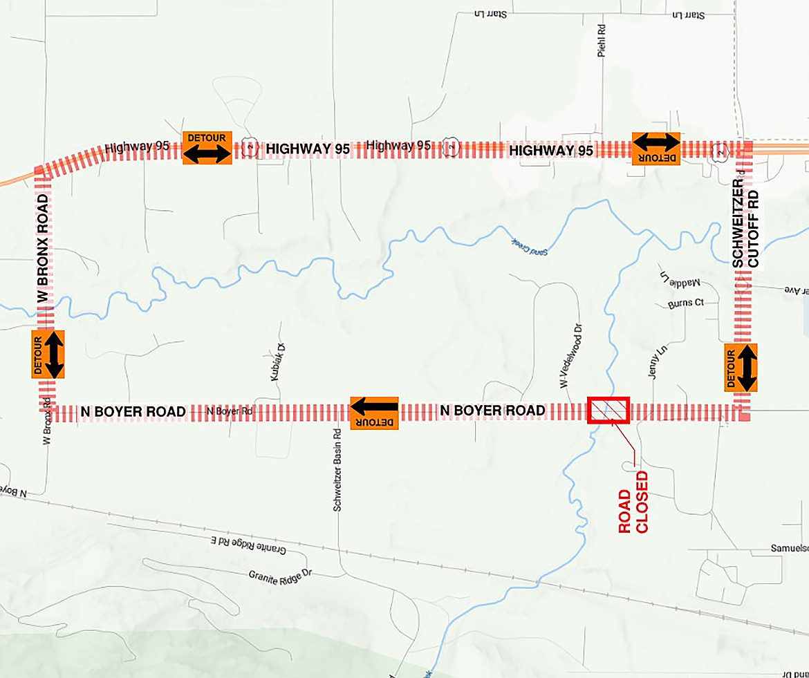 The section of North Boyer Road just after the fairgrounds was closed in early June, shortly after the city identified that the culvert’s condition was rapidly deteriorating. The city of Sandpoint declared the culvert failure as an emergency later in early July.