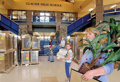 In this June 2007 file photo, Glacier High School teacher Kristyn Morin, right, greets Principal Callie Langohr (not pictured) in the commons area of the new school on her way to her classroom. Morin, who will teach world and U.S. history at Glacier, previously taught those subjects at Flathead High for 16 years. Morin also graduated from Flathead High, as did her daughter, parents and grandparents. Morin was accompanied by fellow Flathead teachers Genia Allen-Schmid, left, and Melanie Dardis, as well as Dardis' daughter, Emily. (Karen Nichols/Daily Inter Lake file photo)