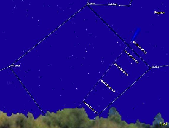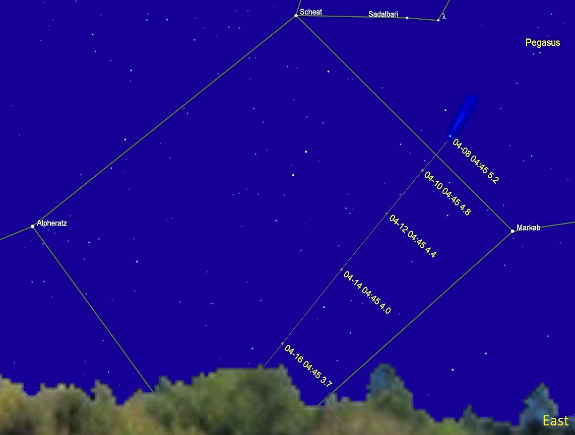 Comet C/2025 R3 (PANSTARRS) will make its closest approach to the Earth on April 26. On this date in North Idaho, it will not be readily observable since it will be very close to the Sun. After this date it is not observable because it stays to near the Sun’s glare. So, we have to move our observing window to the second week of April. The predicted brightness could be as bright as the stars that make up the Great Square of Pegasus, around 3rd magnitude. This brightness level makes this comet a naked eye object. Look low in the East to find the Great Square of Pegasus at 4:45 am. Using binoculars would really enhance the view.