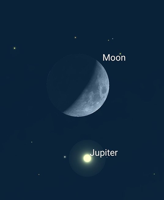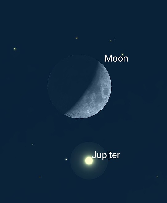 Look high in the Southwest sky at 8:30pm to see the nearly first quarter moon less than 4 degrees from the bright planet Jupiter.