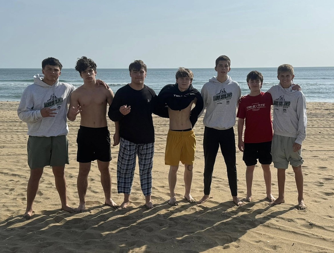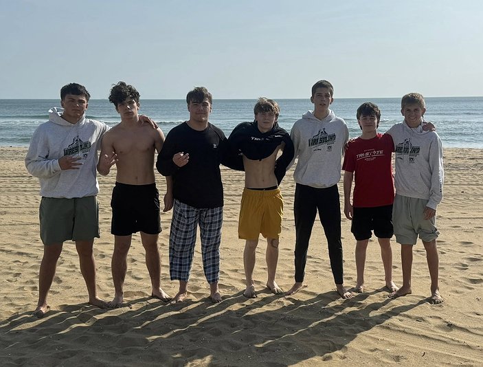 Courtesy photo Members of the Lakeland High wrestling team prepare for a workout before the National High School Coaches Association National tournament in Virginia Beach, Va., last weekend. From left are Emmit Rivadeneira, Gage McWatters, Peyton Sardinha, Carson Leonard, Kade Knopp, Zach Teal and Cruz Knopp.