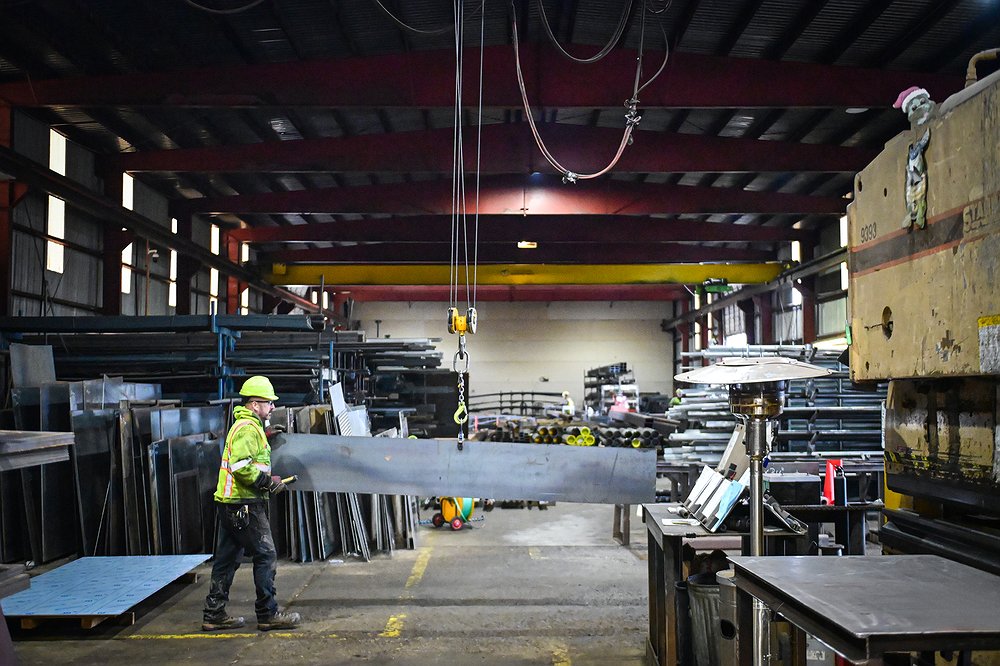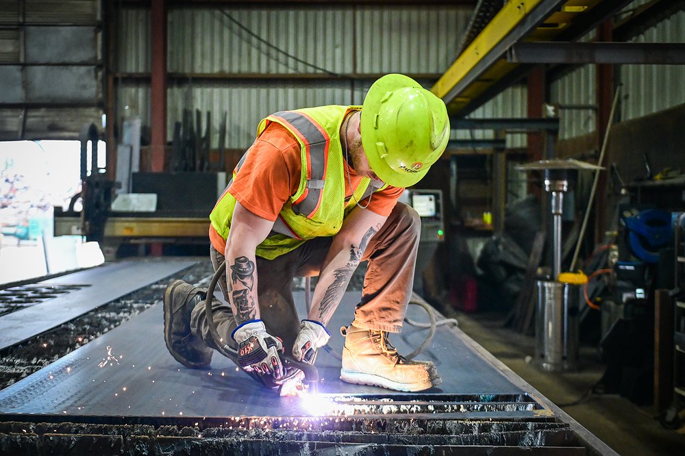 In the steel facility, Pacific employees are hard at work shaping, cutting and preparing pieces of steel to sell. At one end of the building, a worker is cutting shapes out of metal with a CNC plasma table. Oftentimes, the company will sell recycled steel that started as scrap metal in the yard.