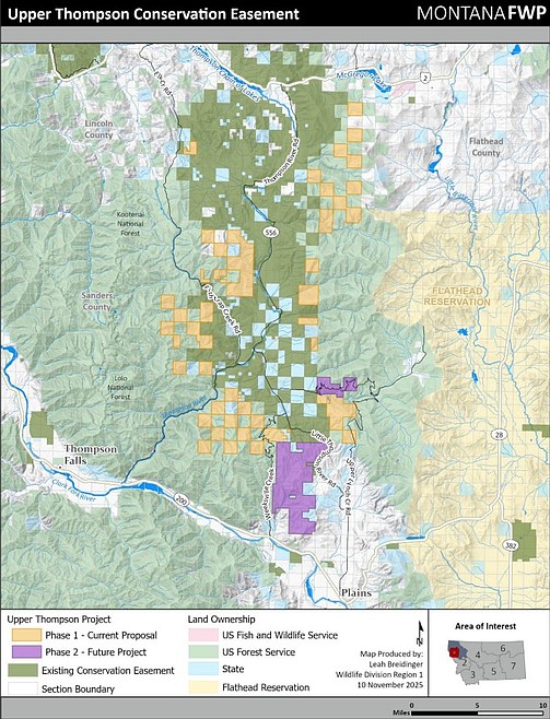 The newly minted Upper Thompson Conservation Easement project will roll out in two phases, according to an environmental assessment released by Montana Fish, Wildlife and Parks last month. The first, encompassing 34,160 acres of private forestland northeast of Thompson Falls, is scheduled to go before the Montana Fish and Wildlife Commission for approval as early as June 2026.
