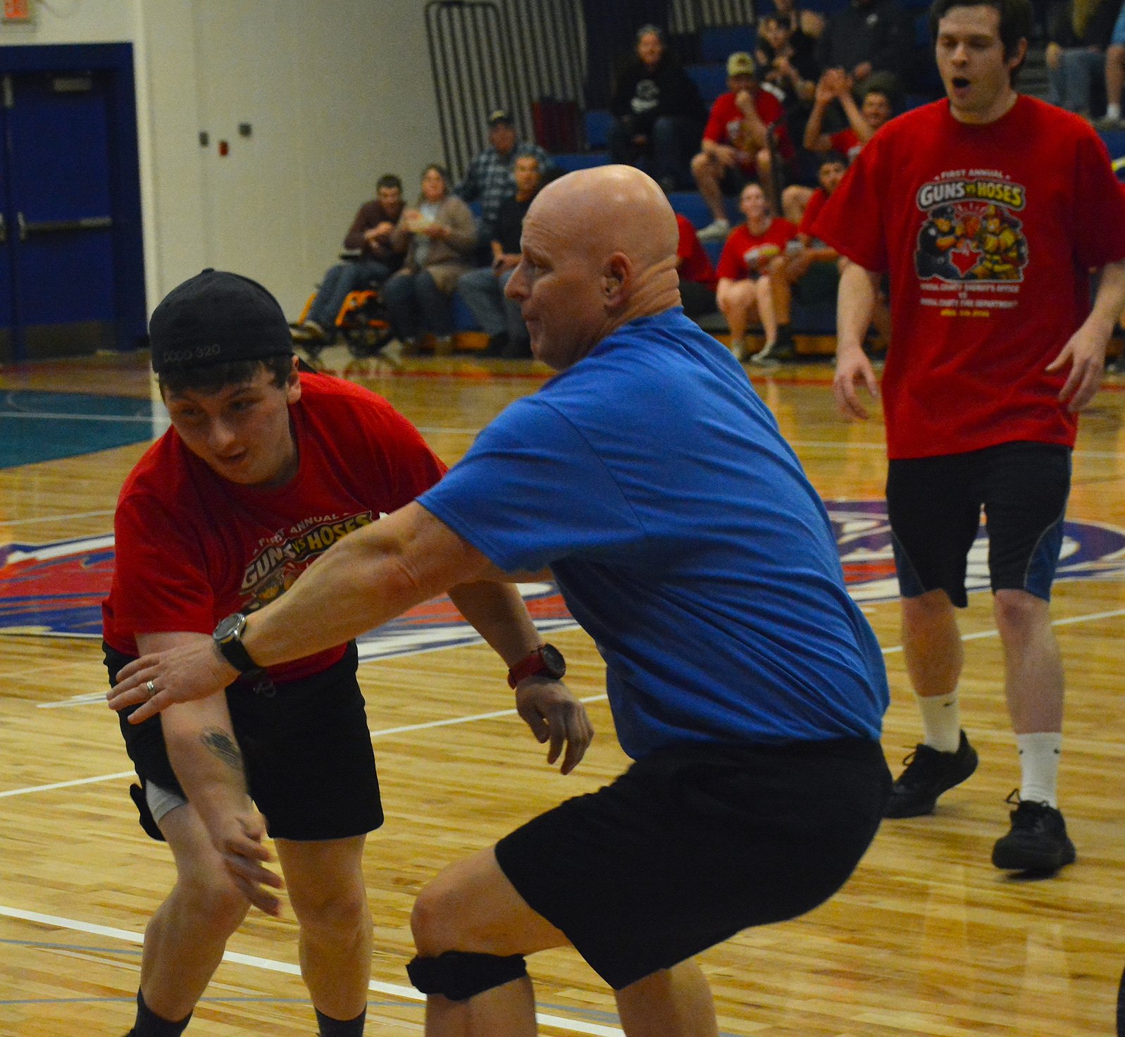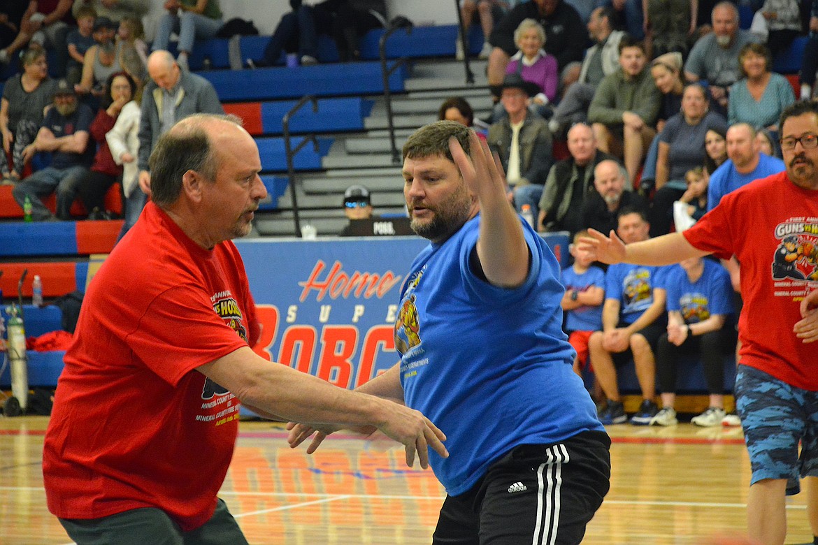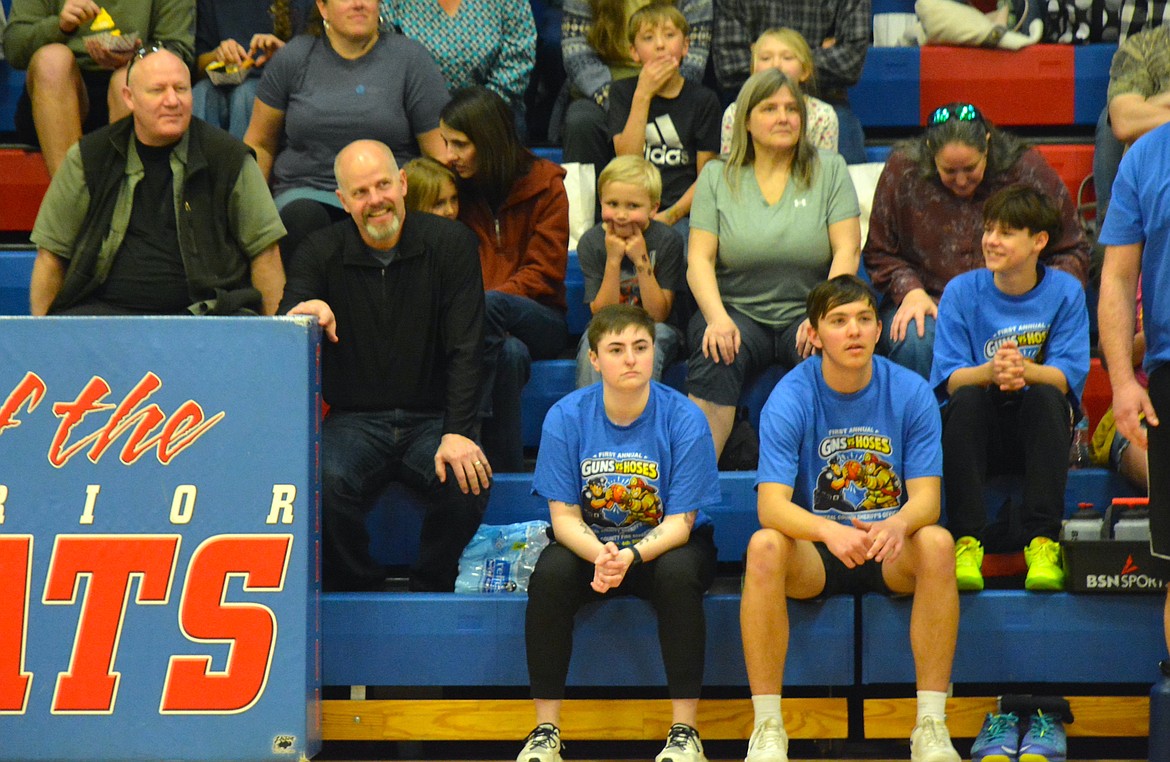 Shawn Smalley, in black, sat on the "blue" side of the bleachers in the Superior High School Gym on Saturday during the first annual Guns vs. Hoses basketball game. Fitting as a former Montana Highway Patrolman who gave 20 years of service to the state, followed by his current role as a county commissioner. He and his family were overwhelmed by the community's generous support during the benefit game and live auctions held to provide financial assistance as Shawn undergoes treatment for stage 4 colon cancer. Over $40,000 were raised for the Smalley family on April 4, with incredible donations such as guided hunts, firearms, fly fishing trips, a BBQ, and much more. (Mineral Independent/Amy Quinlivan)