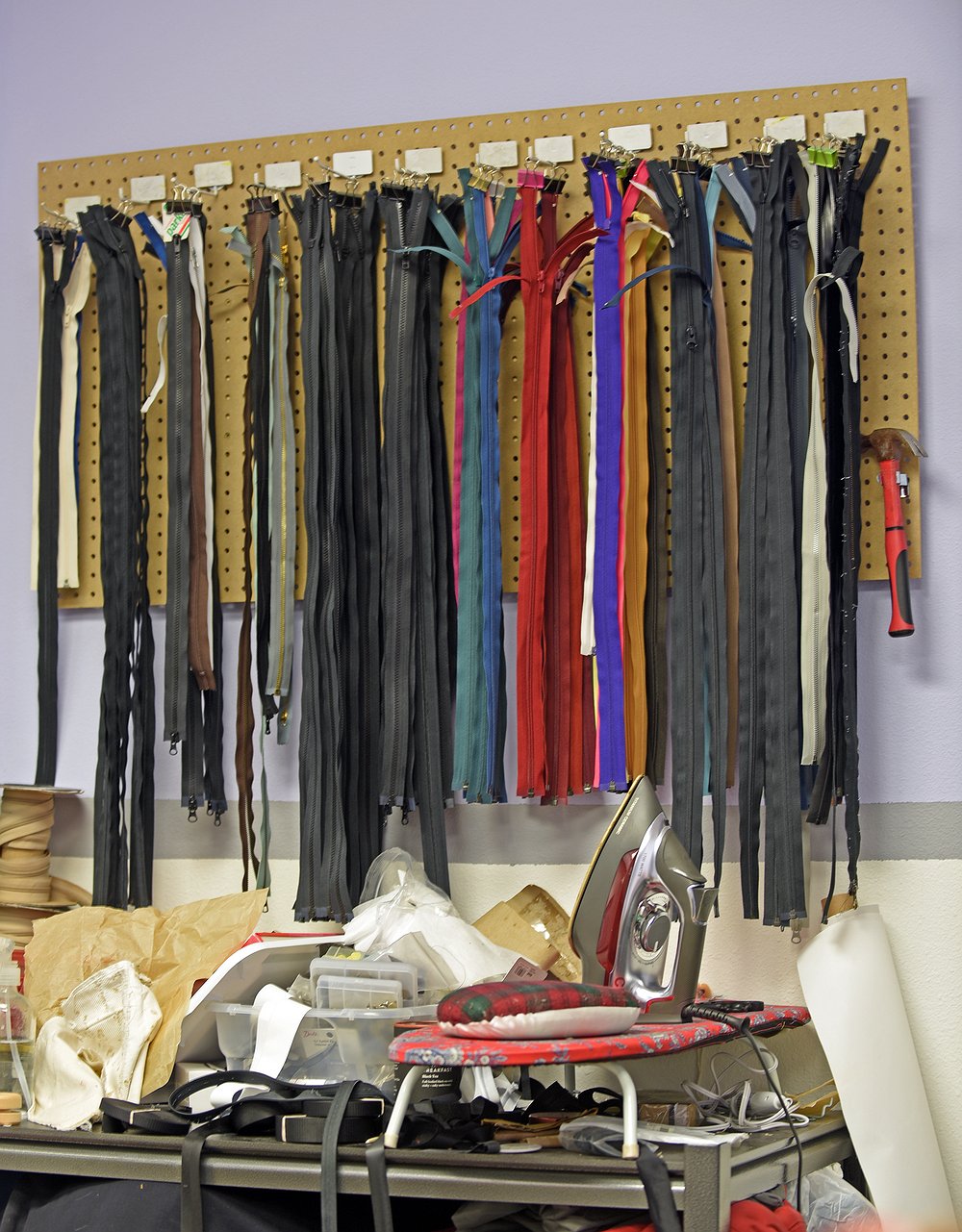 Five sewing machines and a serger stand at the ready. Racks of jackets wait their turn, and sacks of bags fill two corners of the small workspace. One hundred zippers hang from one board and on another, different widths of webbing.