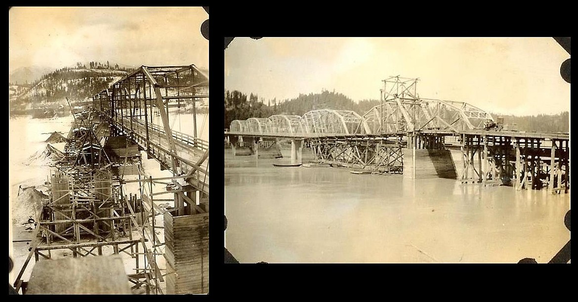 The high wooden bridge over the Kootenai River at Bonners Ferry, Idaho was built in 1910. The first photograph taken in 1933, shows the construction of the new steel bridge to the east of the wooden. After the steel bridge was completed, the wooden bridge was removed (second photo also taken in 1933).