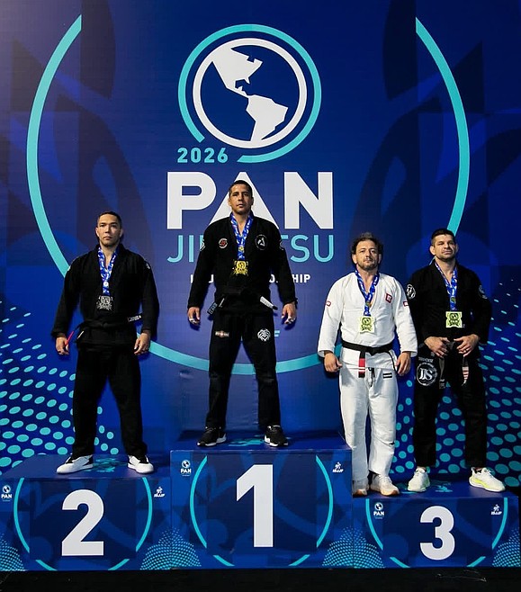 Full caption: Eduardo Alves de Inojosa, a teacher and coach at North Idaho Jiu-Jitsu in Sandpoint, recently was crowned champion at the 2026 IBJJF Pan-American Jiu-Jitsu Championship held March 24 through 29 at Silver Spurs Arena in Kissimmee, Fla. Inojosa, pictured atop the podium alongside Alex Barci Peçanha (second) and Paulo Ricardo Benatto and Vitor Moscon Schlosser (tied for third), claimed the Master 2 Black Belt Super-Heavy (222 pounds) division while representing Six Blades Jiu-Jitsu. With his win at the event, considered to be one of the four major Brazilian Jiu-Jitsu tournaments in the world, Inojosa now ranks as No. 9 internationally. "This victory has meant a milestone in my career as an athlete," Inojosa noted. "Being a champion isn’t just about the medal on your chest, it is the feeling of overcoming yourself — and your greatest adversary: your own mind.”