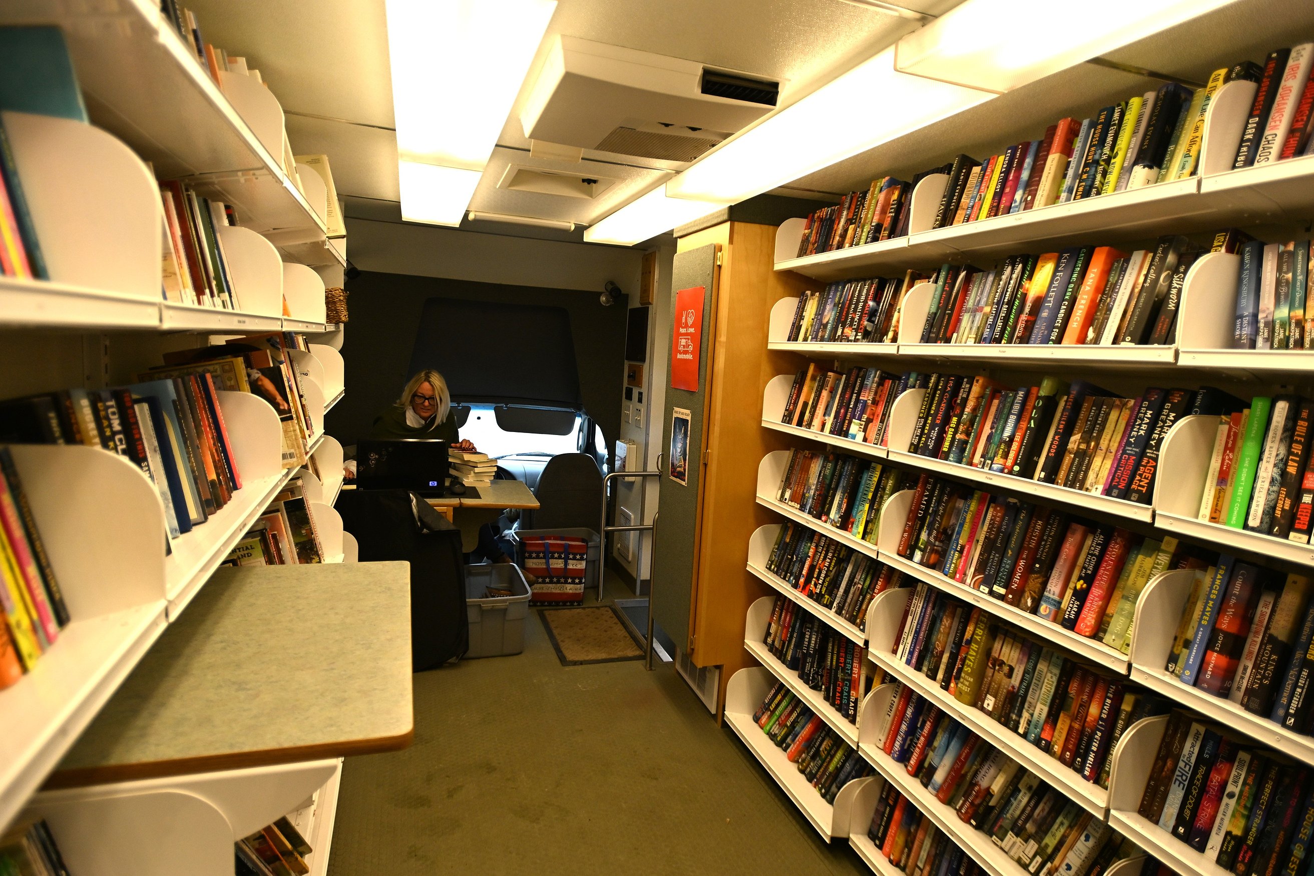 The school’s doors opened as a substitute teacher ushered out a couple of first graders. Carefully, they climbed up the van’s tiny steps and stepped into a cozy library.