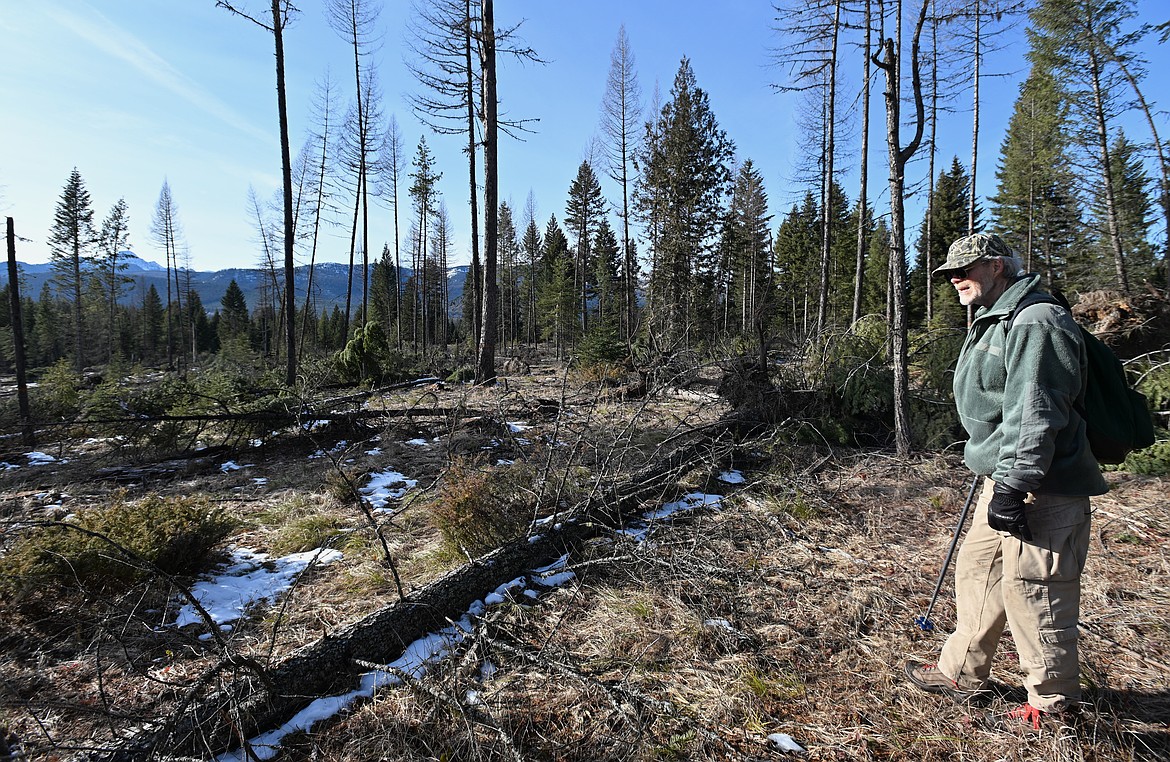 In one unit about 10 miles northwest of Condon, at least half of the trees left standing at the end of a recent logging operation were downed by the December windstorm. Mark Benedict, a resident whose property backed up to this section of the Flathead National Forest, surveyed the damage from the crest of hill in late January.