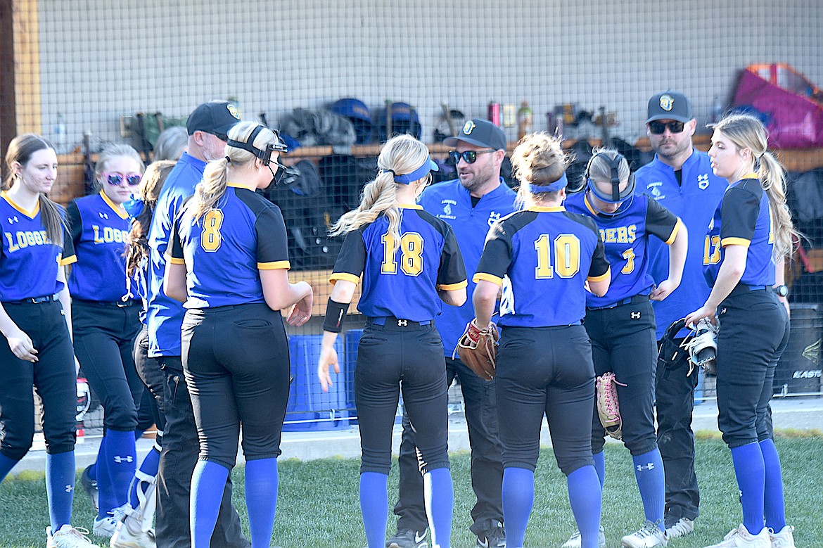 The Libby Loggers varsity softball team and coaches celebrate a win Thursday, April 9, 2026, against Whitefish.