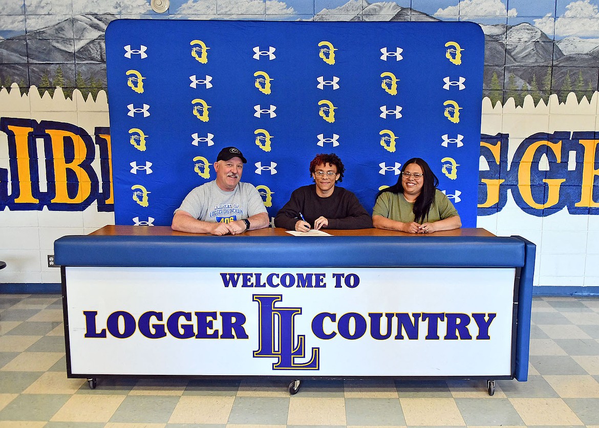 Libby Greenchain wrestler Jeremiah Thomas, center, signs a letter of intent Wednesday, April 8, 2026, to accept a wrestling scholarship at Simpson University in Redding, California. Thomas is flanked by his mother, Skycayla Davidson and Libby wrestling head coach Dean Thompson. Thomas said he is really excited about the opportunity. He qualified for the 2026 Montana High School Athletic Association Class A Wrestling Championships. He was 24-11 this season and 44-34 overall.