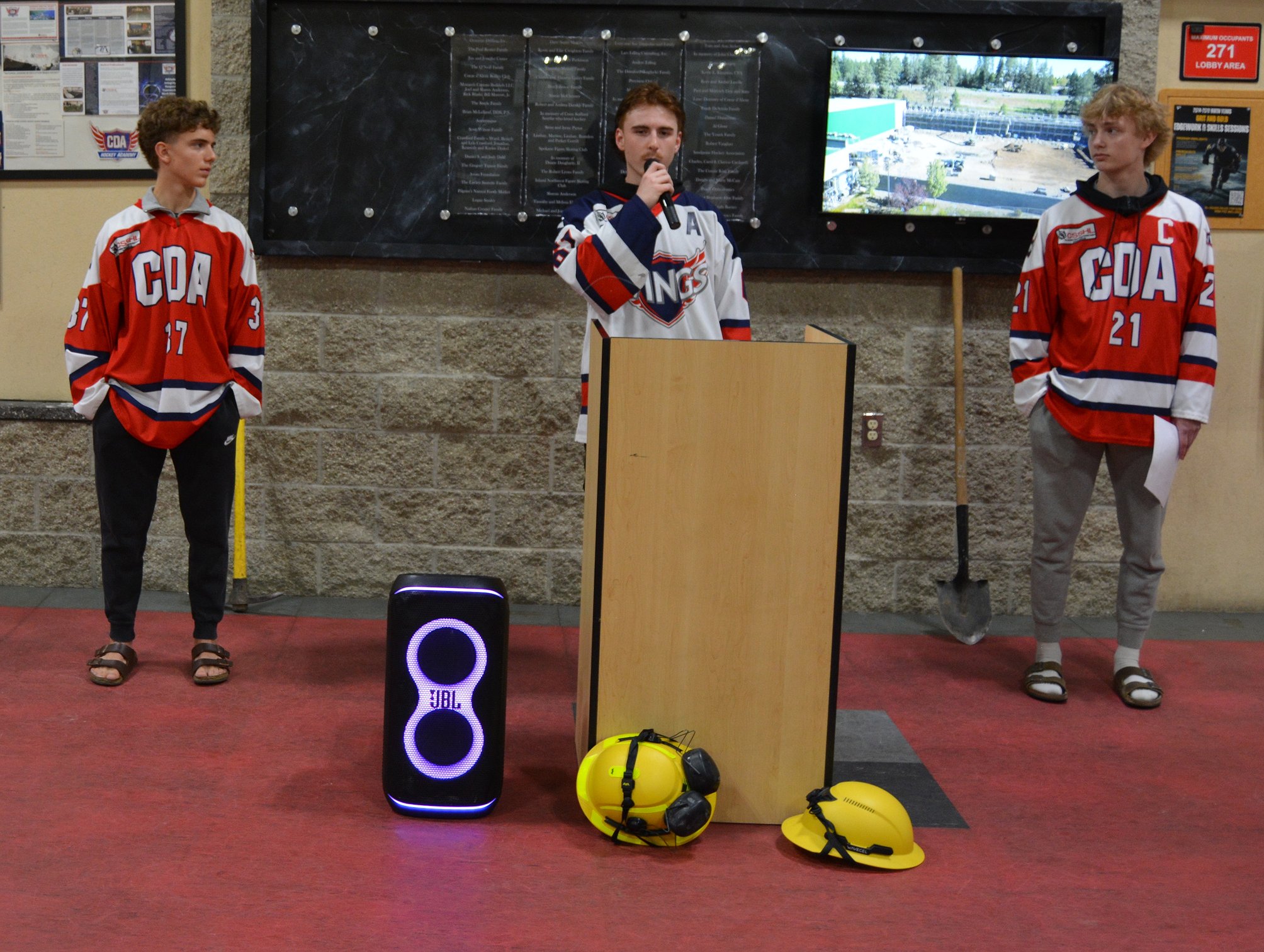 Gunnar Podollan, Tyler Karchut and Kade Ziemendorf of CDA Hockey Academy Youth Council address the audience about how the second rink will benefit local hockey at the Frontier Ice Rink.