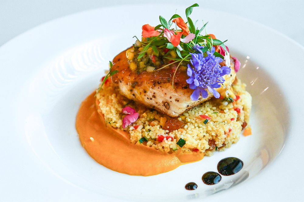 Ahead of opening for the dinner shift, Lepe made the staff the night’s special: fresh halibut with a mango-orange glaze and mango salsa, topped over Moroccan couscous.
