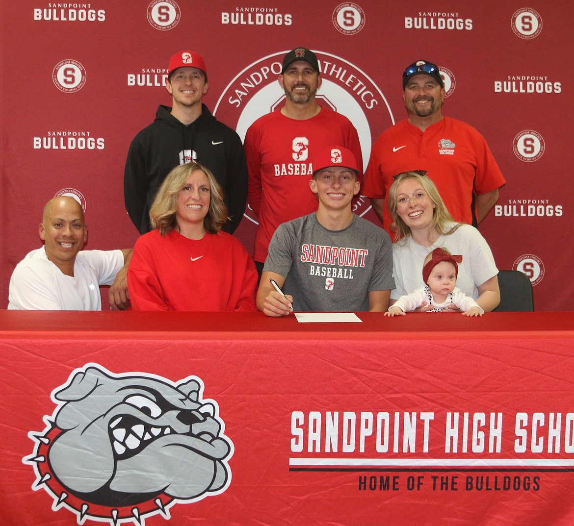 Full caption: Sandpoint's Parker Reichart recently committed to continue his baseball career at Spokane Colleges (NWAC) in Spokane, Wash. A 5-foot-10-inch standout shortstop and right-handed pitcher, Reichart was a 2025 All-Inland Empire League selection as a junior. A three-year member of the Sandpoint High varsity baseball team, Reichart has steadily improved his batting average every season thus far, hitting .386 (17-for-44) to go along with a .517 on-base percentage so far this year. Lifetime, he holds a .306 (49-for-160) batting average across 205 plate appearances. To date, Reichart, who also sees time at second base, has recorded 49 hits, including four doubles and a triple, 33 RBIs and 14 stolen bases. On the mound, he's compiled 53 strikeouts over 49.2 innings of work. "Parker's been great for us this year," Sandpoint High head coach Jesse Dunham said. "Not only is he a hard worker, but he's a leader on the field. He's super coachable and super athletic. He can play both ways in college and Spokane is lucky to have him." Pictured, back row, from left are Sandpoint High head baseball coach Jesse Dunham, Sandpoint High assistant baseball coach Don Little, and Sandpoint High Athletic Director TJ Clary. Front row, from left are Daniel DeHaro, Lori Reichart, Parker Reichart and Gracie Ramsay. Sitting with Gracie is Kennedy Ramsay.