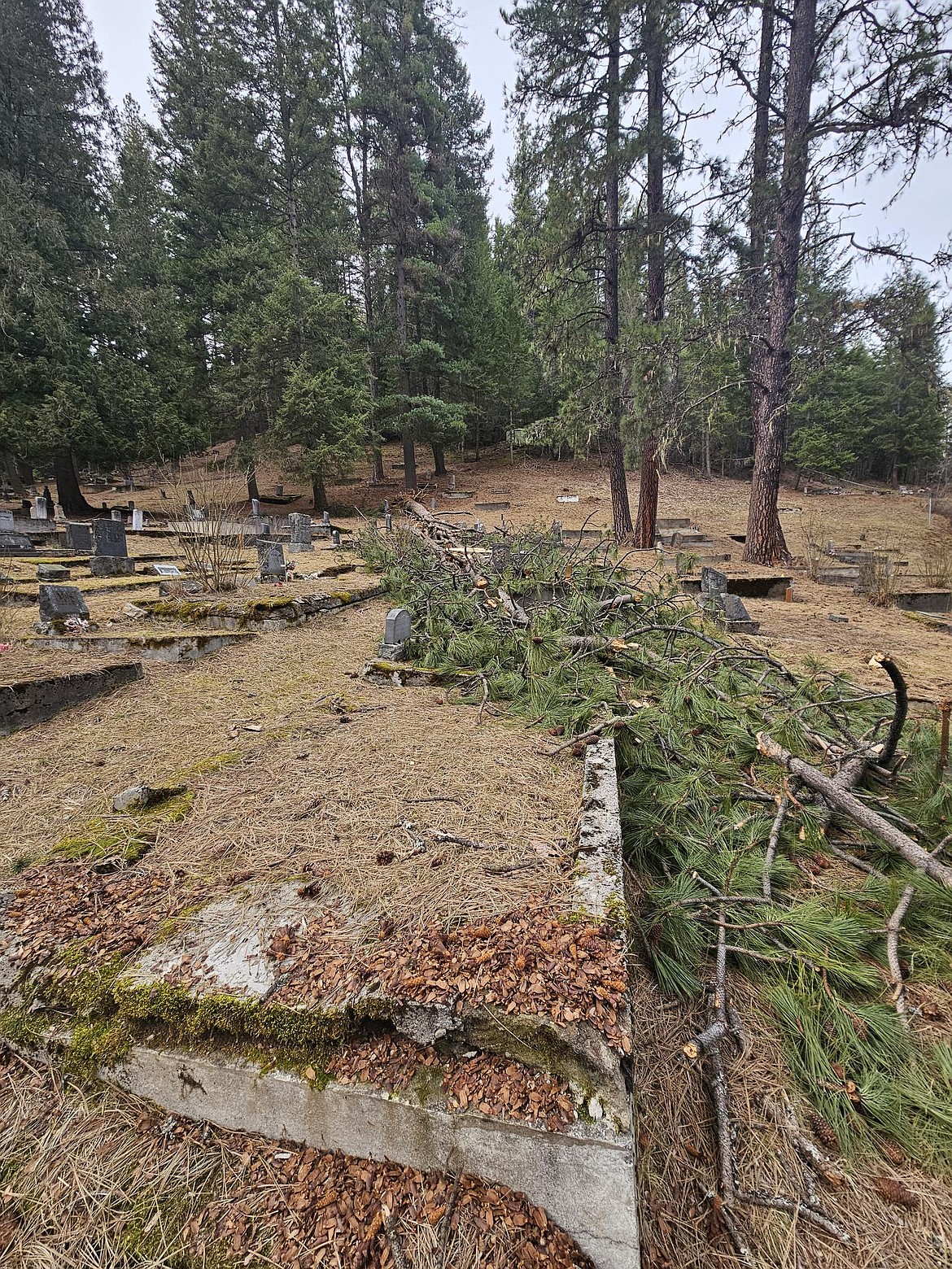 Several storms over recent months knocked down trees and limbs, scattering branches and pine needles throughout the cemetery. The damage affected several headstones and sections of the cemetery’s urn wall. Organizers are seeking community help to restore the grounds ahead of Memorial Day observances.