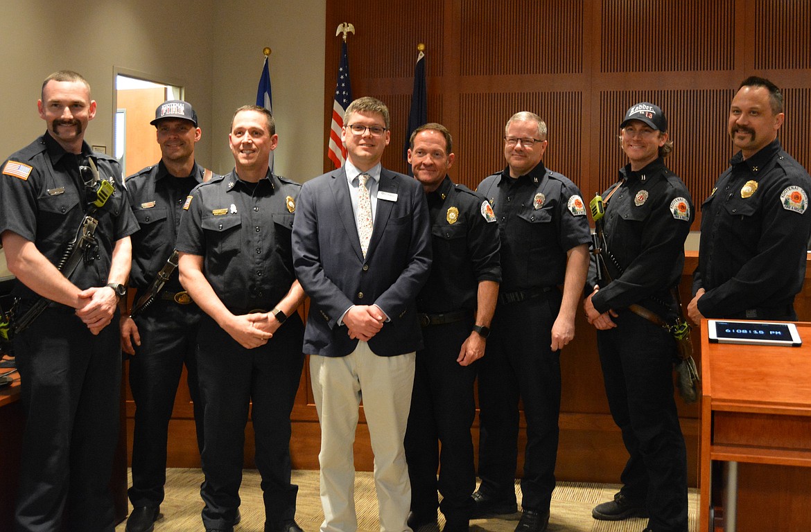 Post Falls Mayor Randy Westlund issued a proclamation for the city to celebrate National Fallen Firefighters Month honoring Kootenai County Fire and Rescue Battalion Chief Frank J. Harwood and Coeur d'Alene Fire Battalion Chief John G. Morrison. The commemorative event will be recognized by the city from April 26 through May 3 by using red lights for landmarks, businesses, firehouses and homes. From left, Jeff Burnworth, Shea Vucinich, Mitchell Copstead, Randy Westlund, Pete Holley, Seth Hohenstreet, Fritz Gibson and Kaipo Kuehu.