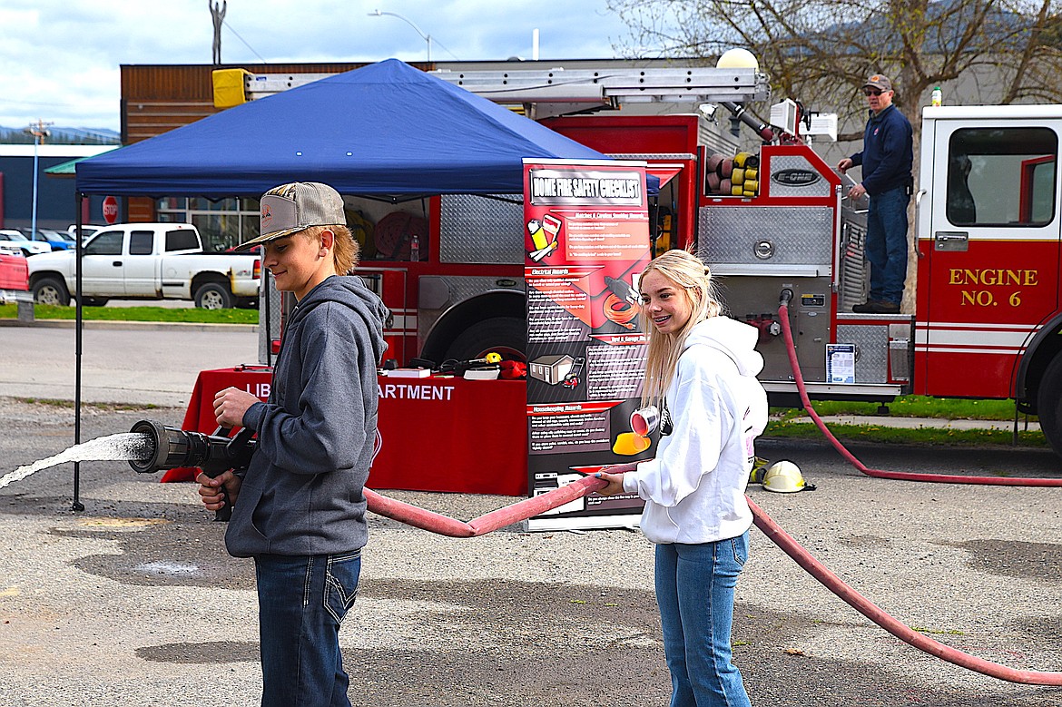 Libby High School students Easton Peterson and Brently Houston got some experience in operating a fire hose while Libby Volunteer Fire Department Chief Steve Lauer prepares to increase the water flow Wednesday, April 22, 2026, at the Rural Northwest Montana Workforce Expo.