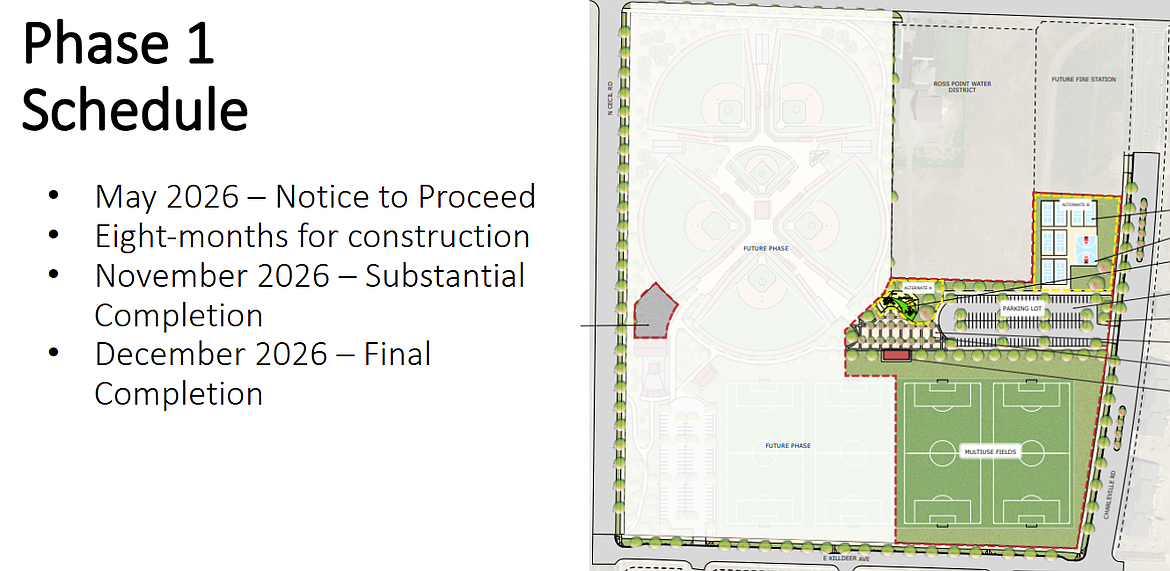 Construction is expected to begin in May. Phase 1 of the Quarry Sports Complex is projected to be completed in December.