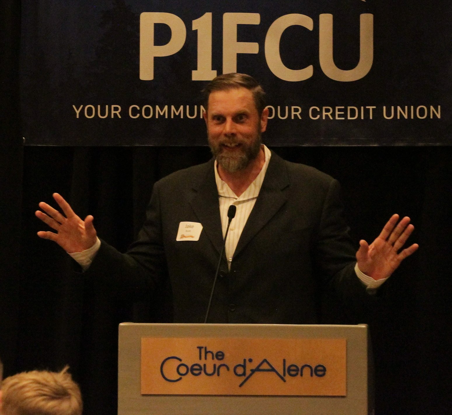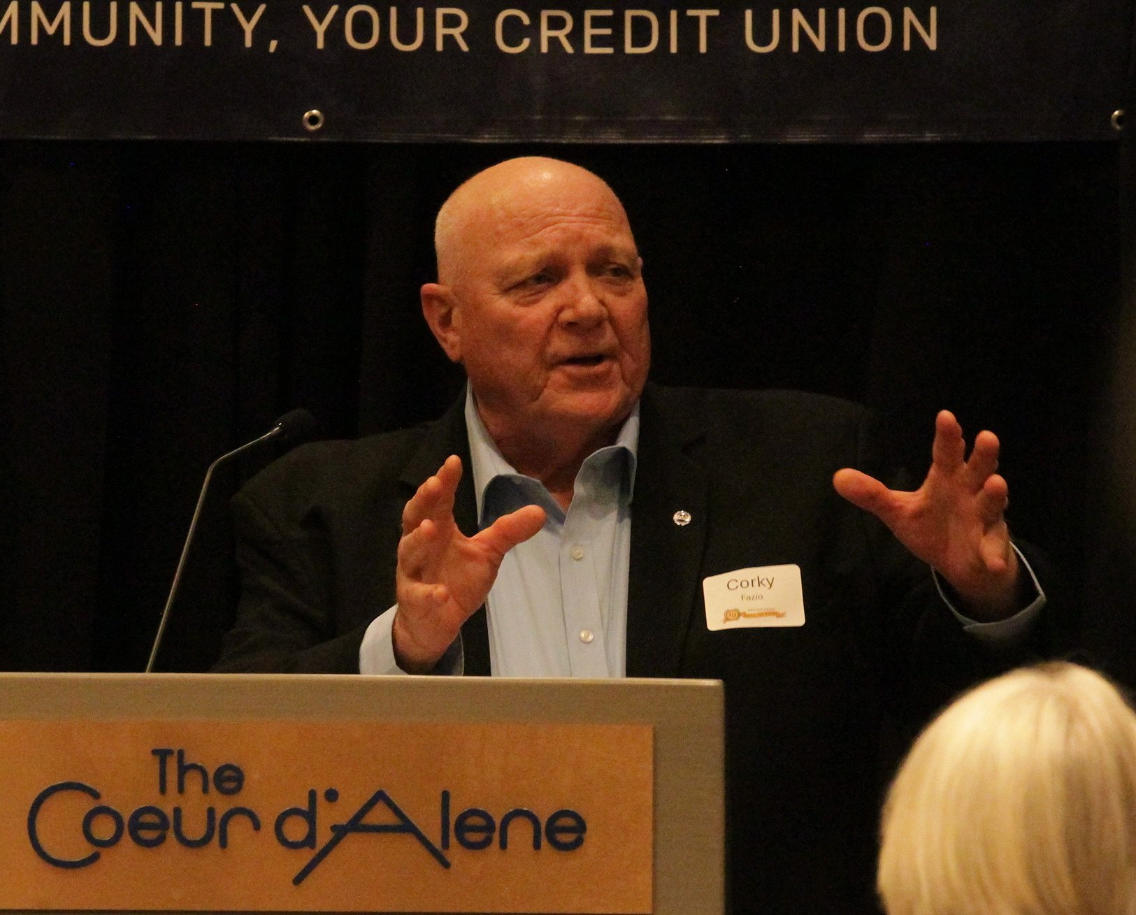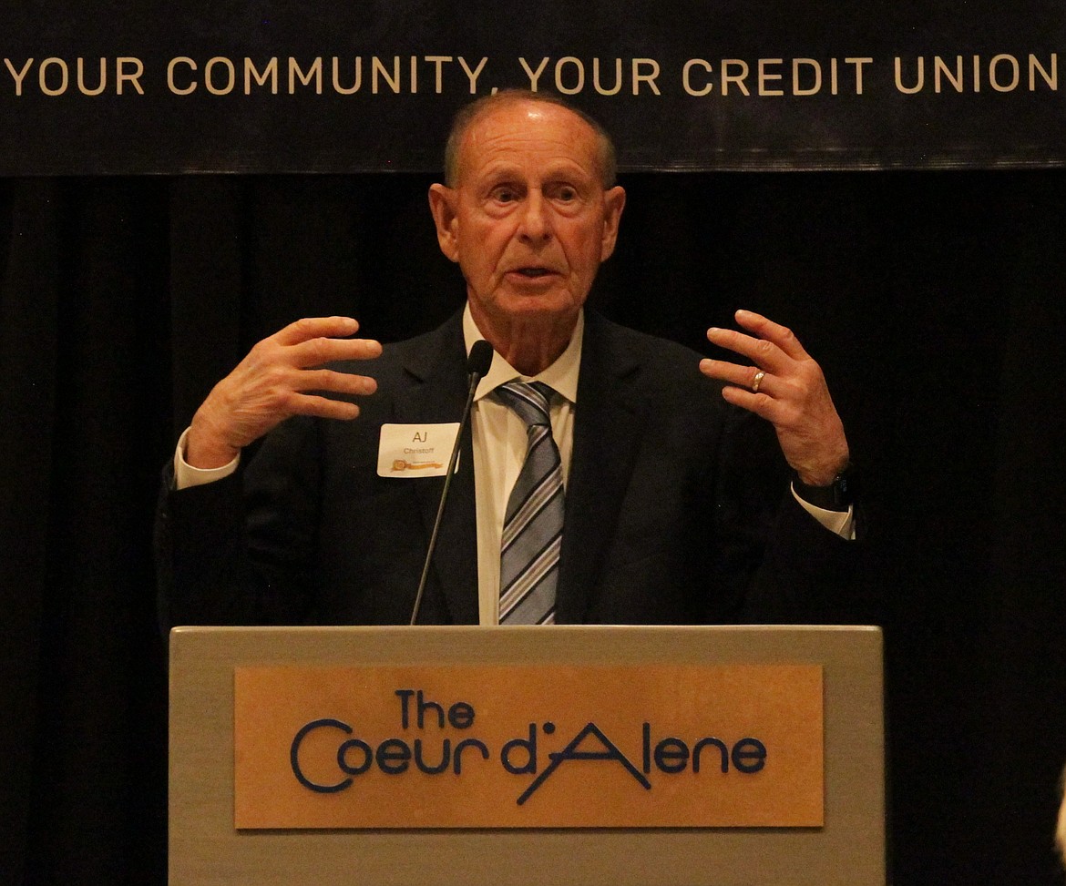 MARK NELKE/Press Former Idaho football player and college football assistant coach AJ Christoff speaks at the North Idaho Athletic Hall of Fame banquet Friday night at The Coeur d'Alene Resort. Inductees will also be honored Saturday night at the 64th North Idaho Sports Banquet at The Resort.
