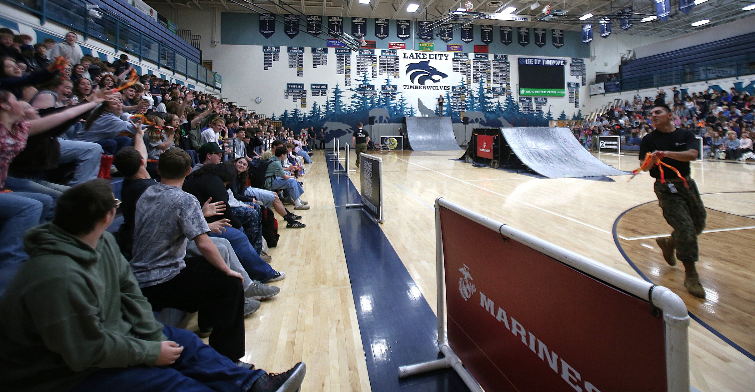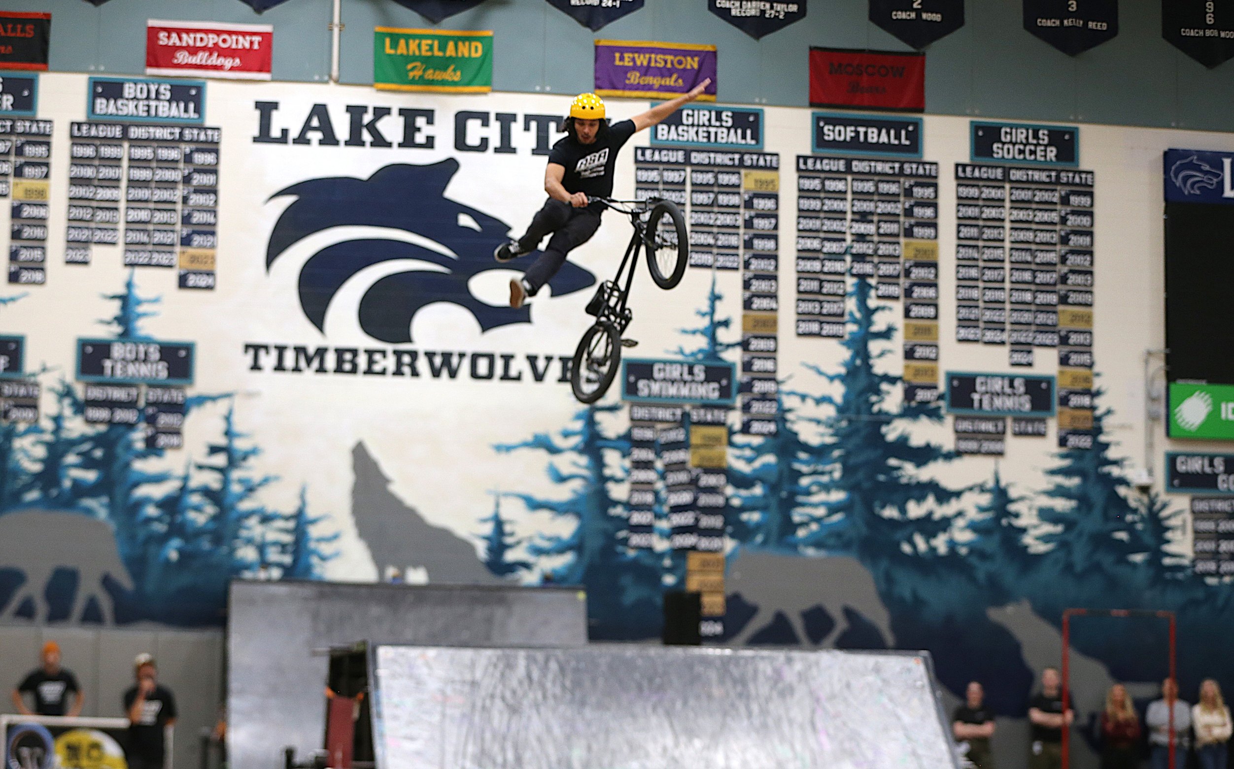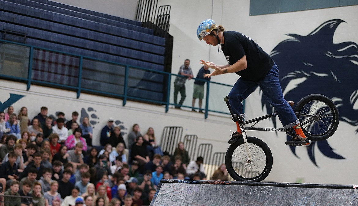 Professional BMX athletes with the No Hate High School Tour zoomed up ramps and caught air in the Lake City High School gym, soaring overhead into Superman stunts, 360s, backflips and other aerial acrobatics that caused jaws to drop and applause to explode.