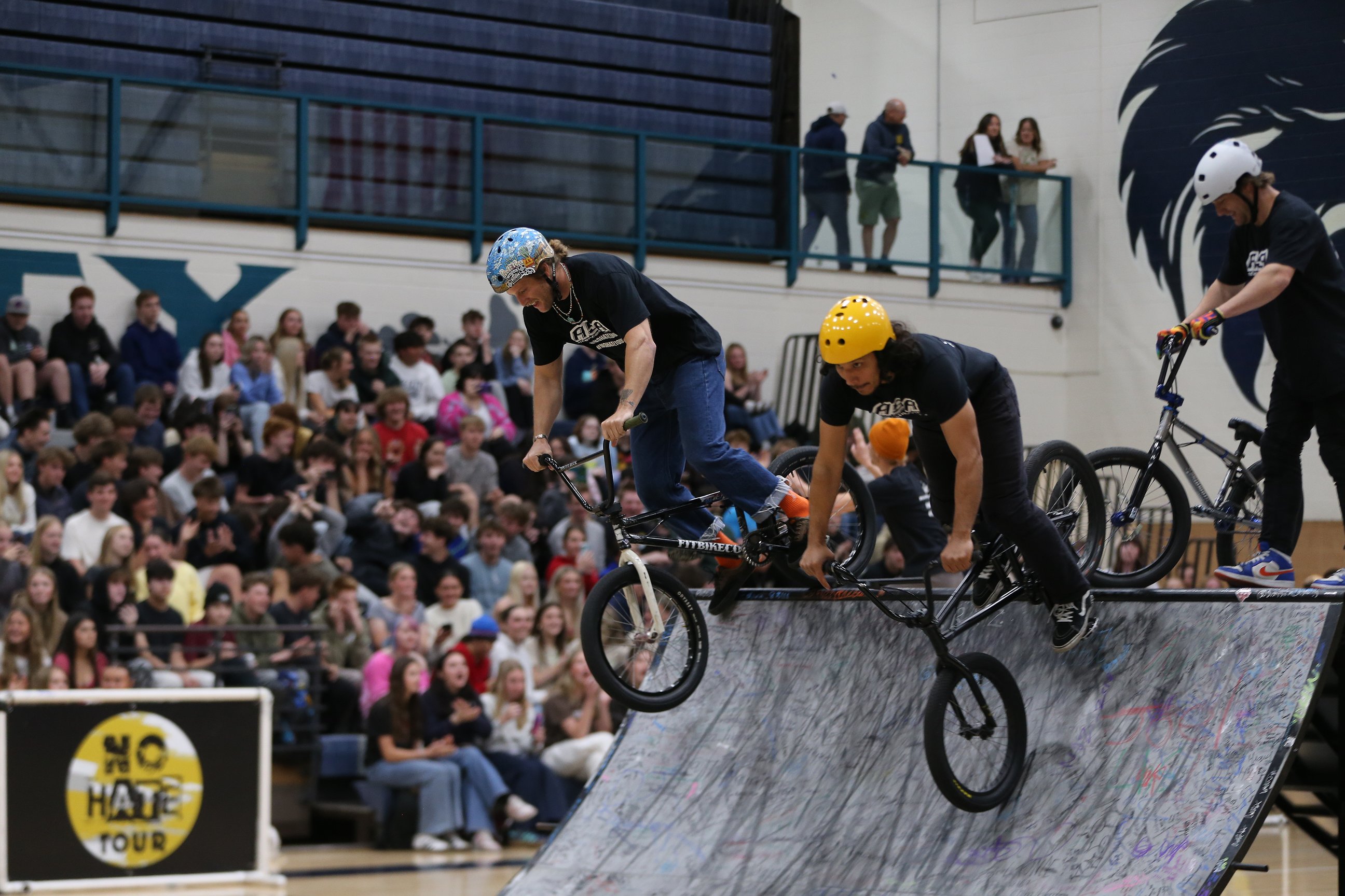 Professional BMX athletes with the No Hate High School Tour zoomed up ramps and caught air in the Lake City High School gym, soaring overhead into Superman stunts, 360s, backflips and other aerial acrobatics that caused jaws to drop and applause to explode. While the bike tricks inspired awe and excitement, the athletes took time between performances to share practical tricks they use in daily life when dealing with hardships like depression and online bullying.