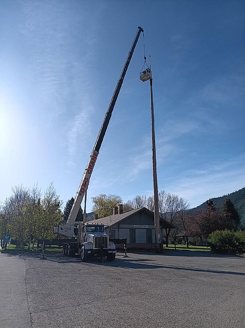 The 100-foot flag pole next to the Alberton Senior Citizens Center/Library was adorned with a new, humongous American Flag last week clearly visible from I-90. D&G Crane Service first had to make repairs to the pole before hoisting Old Glory when she’ll be lighted at night and cared for by the town council and its residents. (Photo by Loreen Felstet)