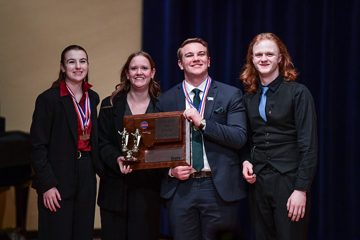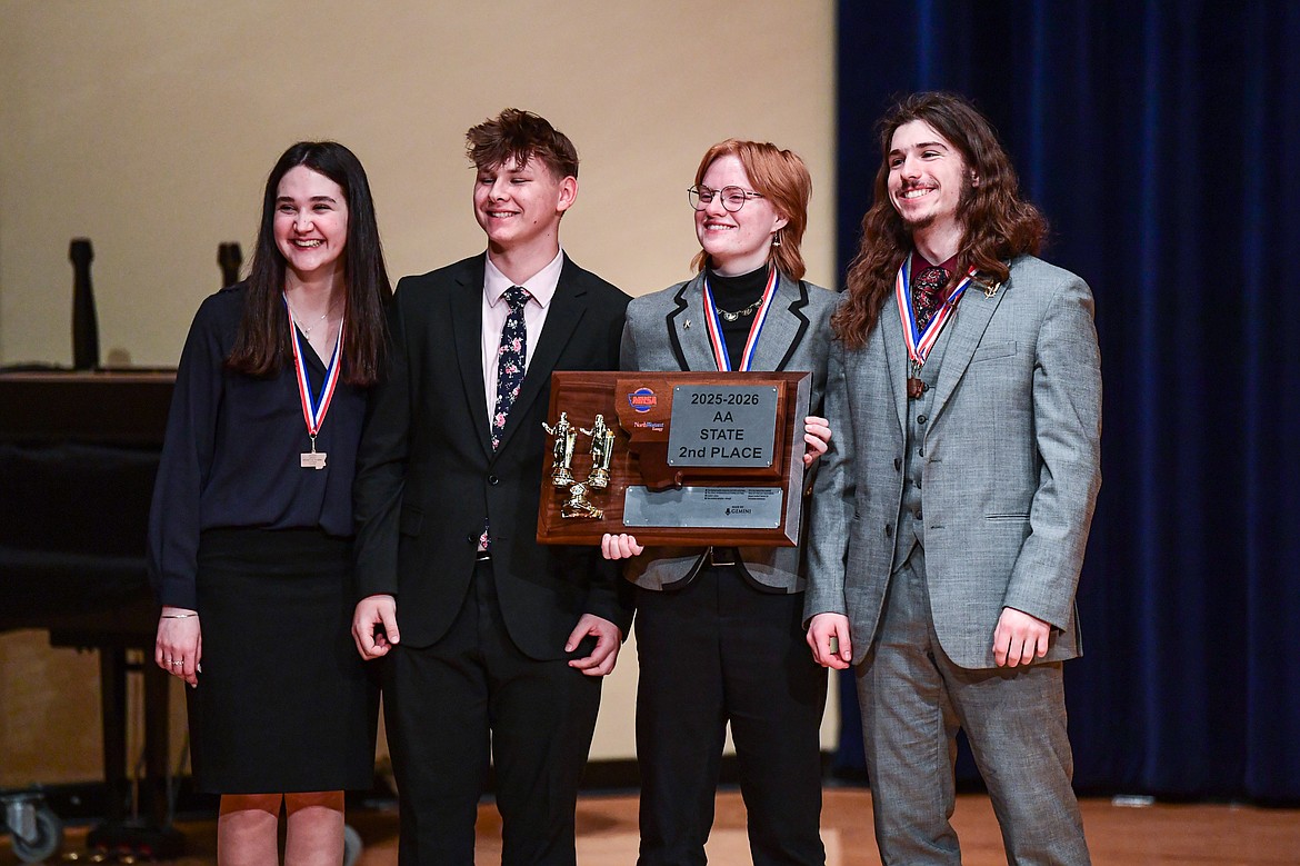 Glacier High School speech and debate team members Eli Sanderson Strutz, Isabelle McKoy, Josh Lee and Fenyx Colby accept the third-place team trophy at the Class AA speech and debate state tournament awards ceremony at the high school on Saturday, Jan. 31, 2026. (Casey Kreider/Daily Inter Lake)