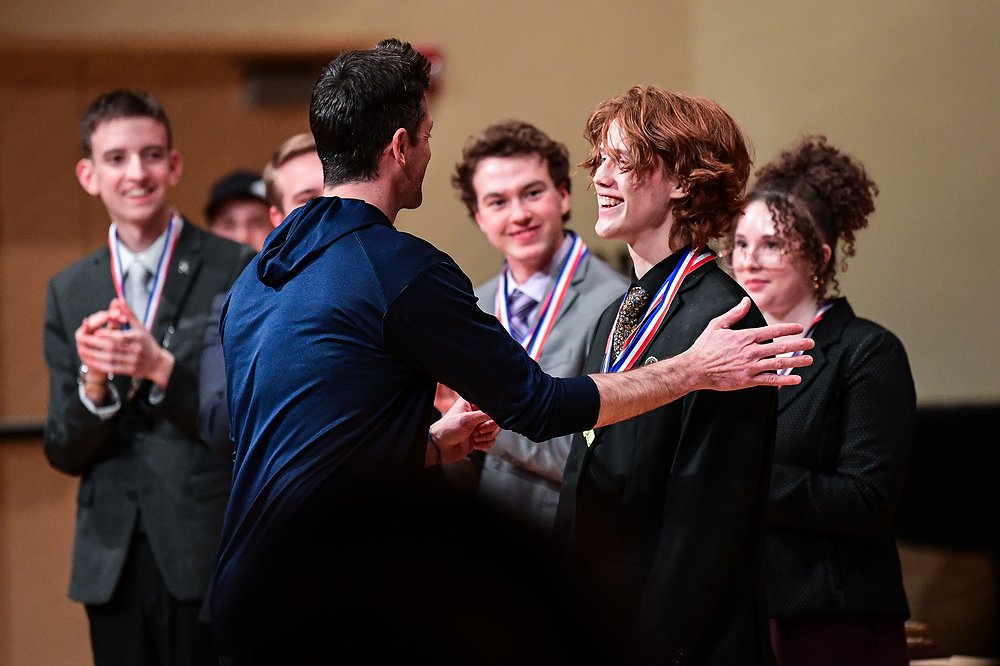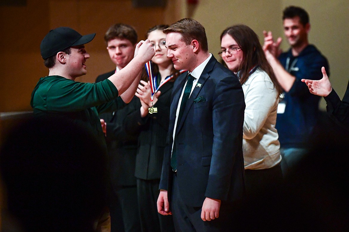 Flathead High School's Fenton Liebe-Cohen receives a state champion medal for one of two individual wins in Impromptu Speaking and Extemporaneous Speaking at the Class AA speech and debate state tournament awards ceremony at Glacier High School on Saturday, Jan. 31, 2026. (Casey Kreider/Daily Inter Lake)ARTICLES BY HILARY MATHESON