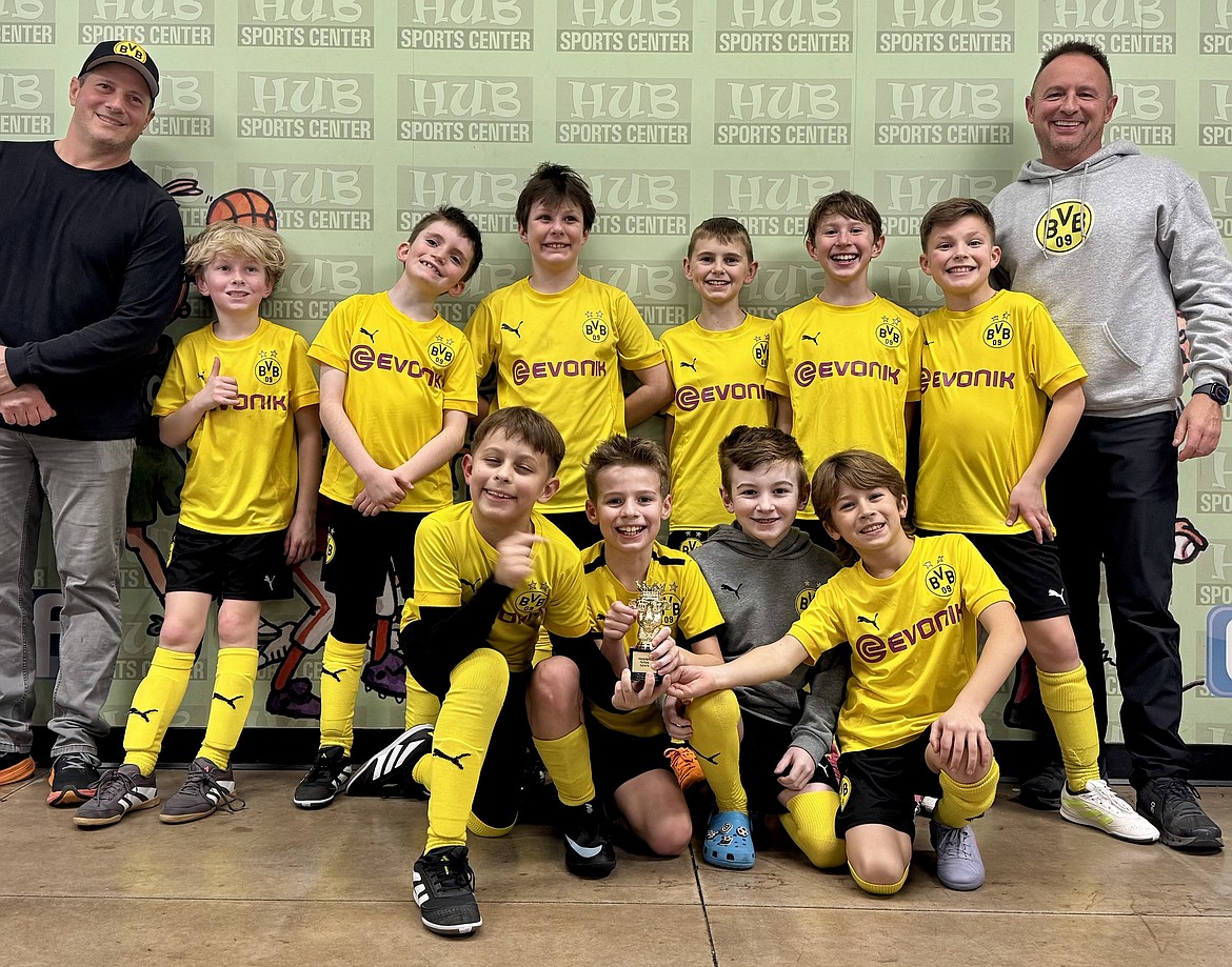 Courtesy photo The BVBIA Idaho 2016 Boys (U10) soccer team played last Saturday in their first-ever Futsal tournament. The Frostbite Futsal tournament was hosted in Liberty Lake by Washington East Surf Soccer Club. After three games BVB led in total points which earned a spot in the championship game, where BVB won 2-1. In the front row from left are Mitchell Volland, Greyson Guy, Colin Happeny and Grayson Martino; and back row from left, coach Dan Martino, Porter Deberard, Kieran MacKeage, Eli Dippolito, Weston Kramer, Waylon Wood, Hugh Erickson and coach Greg Volland.